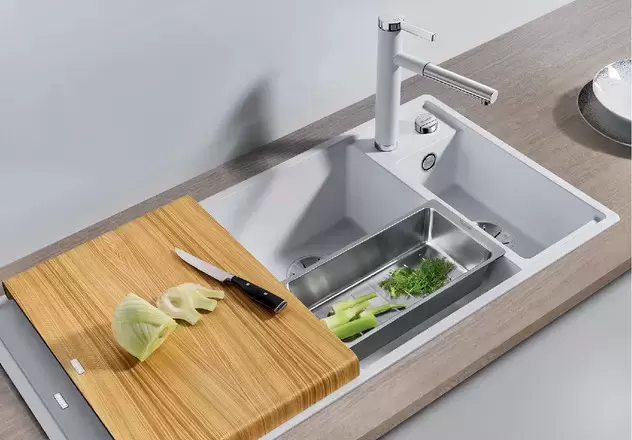 Blanco AXIA III 6 S — гранитная необорачиваемая мойка с просторным крылом для сушки посуды. Высококачественный перелив C-overflow® и отводная арматура InFino® с двумя корзинчатыми вентилями элегантно интегрированы и очень просты в уходе. Модель укомплектована коландером и разделочным столиком из ясеня.