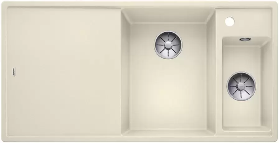 Blanco AXIA III 6 S — гранитная необорачиваемая мойка с просторным крылом для сушки посуды. Высококачественный перелив C-overflow® и отводная арматура InFino® с двумя корзинчатыми вентилями элегантно интегрированы и очень просты в уходе. Модель укомплектована коландером и разделочным столиком из ясеня.