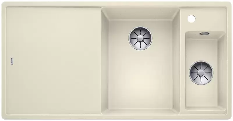 Blanco AXIA III 6 S-F — гранитная мойка с разделочной доской из высокопрочного стекла белого цвета. Модель снабжена двумя разноразмерными чашами и комплектуется практичным коландером для обсушивания овощей, фруктов и зелени. Высококачественный перелив C-overflow® защищает от случайного переполнения раковины водой.
