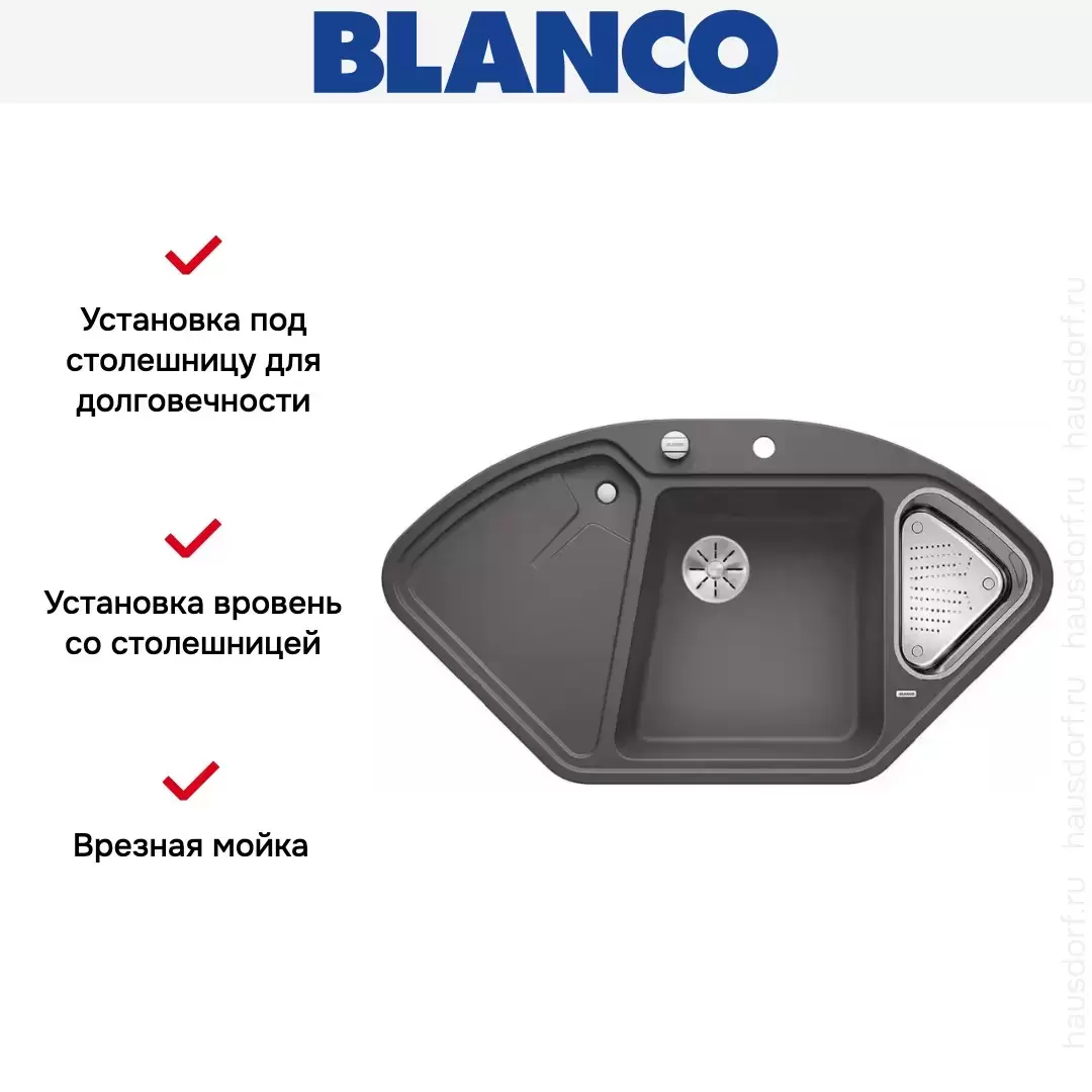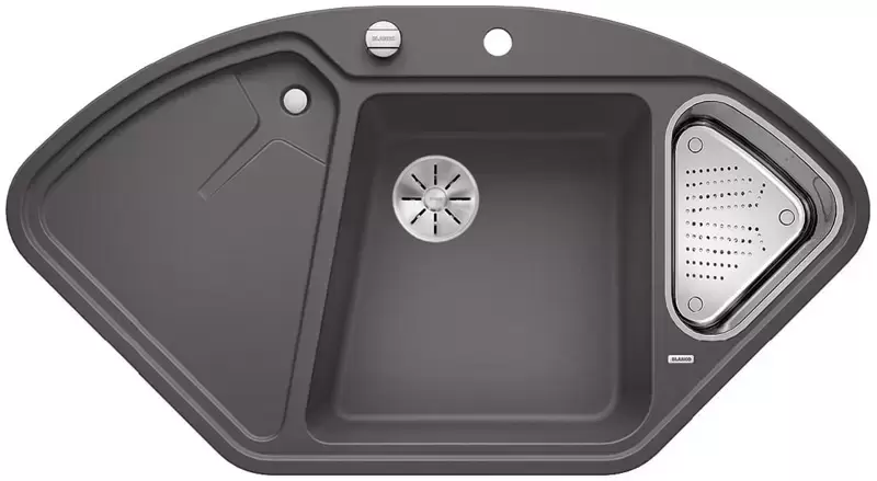 Blanco DELTA II-F SILGRANIT — угловая гранитная мойка, предназначенная для установки в один уровень со столешницей. Трапецивидная форма основной чаши облегчает мытье крупногабаритных предметов посуды. Перфорированный коландер из нержавеющей стали, входящий в комплект поставки модели, оптимально подходит для ополаскивания зелени или разморозки продуктов.