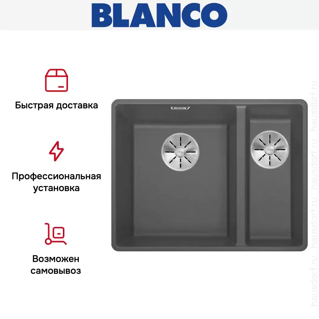Blanco SUBLINE 340/160-F — гранитная мойка с двумя разноразмерными чашами. Модель предназначена для монтажа в один уровень со столешницей. В комплекте предусмотрена отводная арматура InFino® с двумя корзинчатыми вентилями 3 ½".