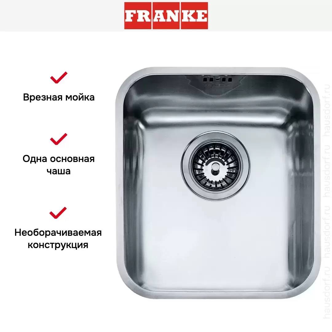 Врезная мойка Franke — отличный выбор для тех, кто хочет создать гармоничное кухонное пространство с полностью вписывающейся в него сантехникой. Преимущество такой конструкции — плотное прилегание к столешнице, так как вырез подбирается индивидуально под габариты модели. Под стыки не попадает вода, поэтому срок службы значительно увеличивается, пользоваться ей удобно и приятно. Данная модель имеет стандартную форму, поэтому подходит большинству пользователей.