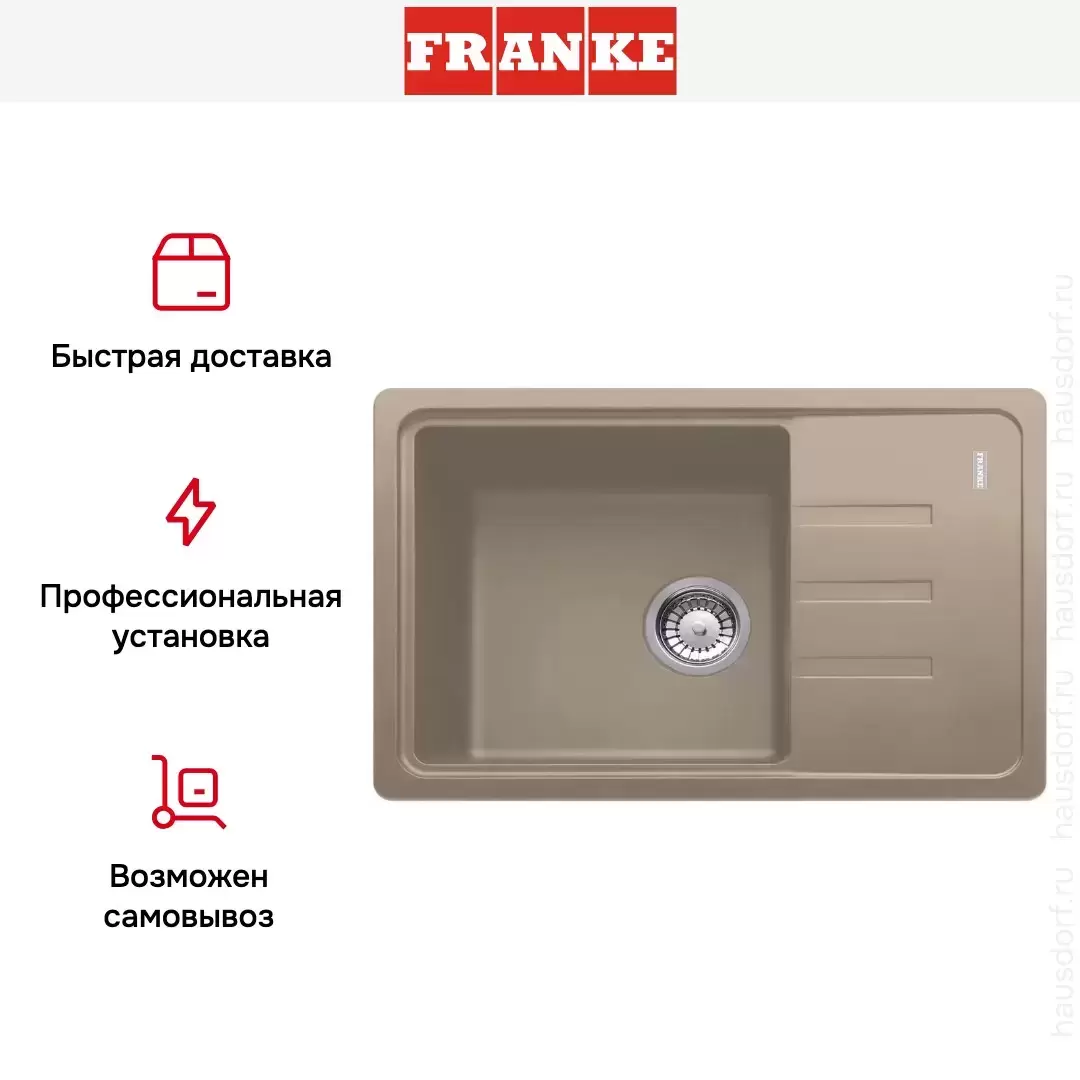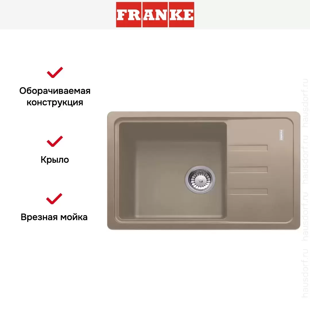 Врезная мойка Franke — отличный выбор для тех, кто хочет создать гармоничное кухонное пространство с полностью вписывающейся в него сантехникой. Преимущество такой конструкции — плотное прилегание к столешнице, так как вырез подбирается индивидуально под габариты модели. Под стыки не попадает вода, поэтому срок службы значительно увеличивается, пользоваться ей удобно и приятно. Данная модель имеет стандартную форму, поэтому подходит большинству пользователей.