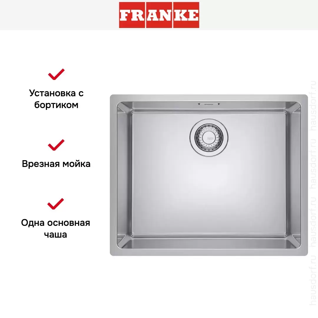 Врезная мойка Franke — отличный выбор для тех, кто хочет создать гармоничное кухонное пространство с полностью вписывающейся в него сантехникой. Преимущество такой конструкции — плотное прилегание к столешнице, так как вырез подбирается индивидуально под габариты модели. Под стыки не попадает вода, поэтому срок службы значительно увеличивается, пользоваться ей удобно и приятно. Данная модель имеет стандартную форму, поэтому подходит большинству пользователей.