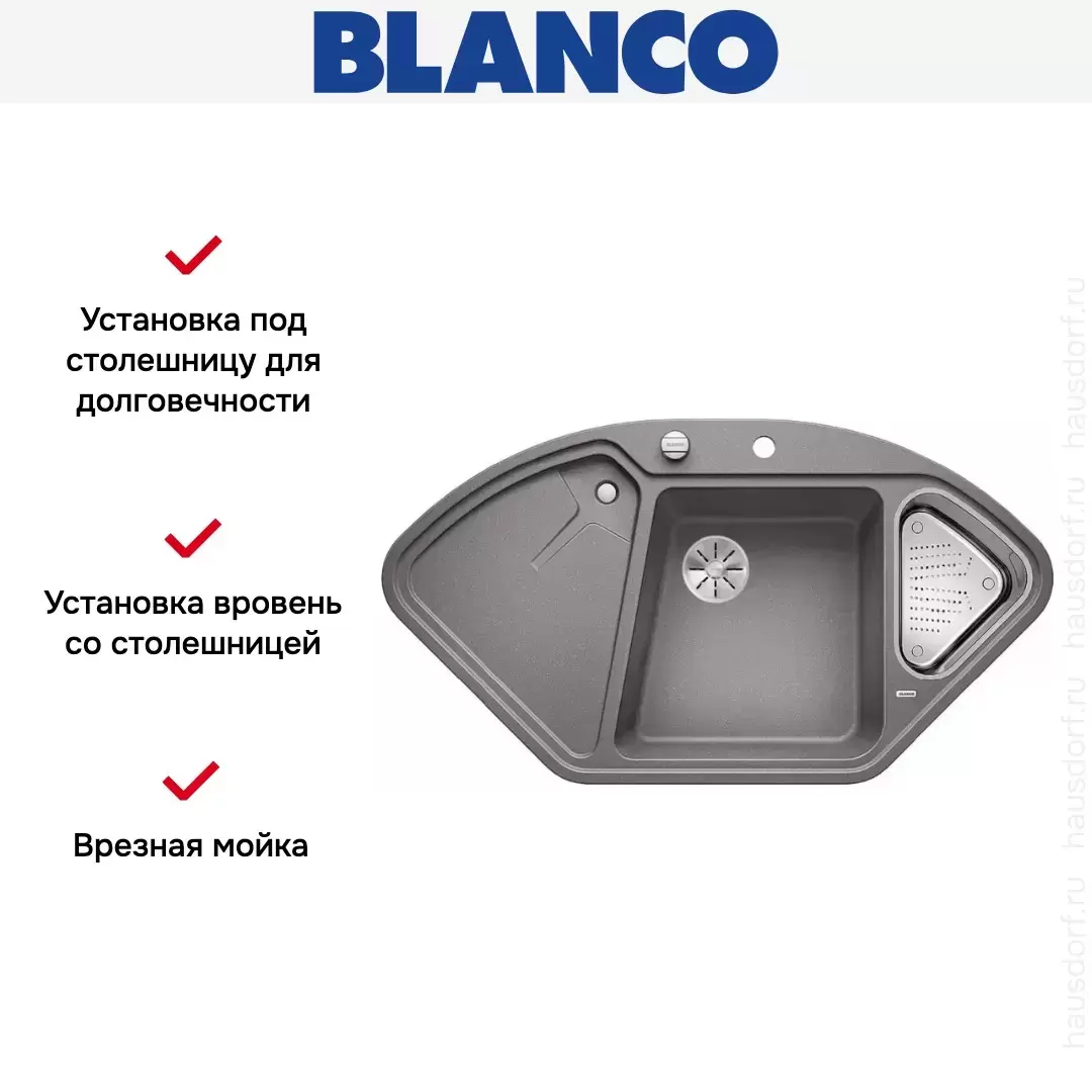 Blanco DELTA II-F SILGRANIT — угловая гранитная мойка, предназначенная для установки в один уровень со столешницей. Трапецивидная форма основной чаши облегчает мытье крупногабаритных предметов посуды. Перфорированный коландер из нержавеющей стали, входящий в комплект поставки модели, оптимально подходит для ополаскивания зелени или разморозки продуктов.