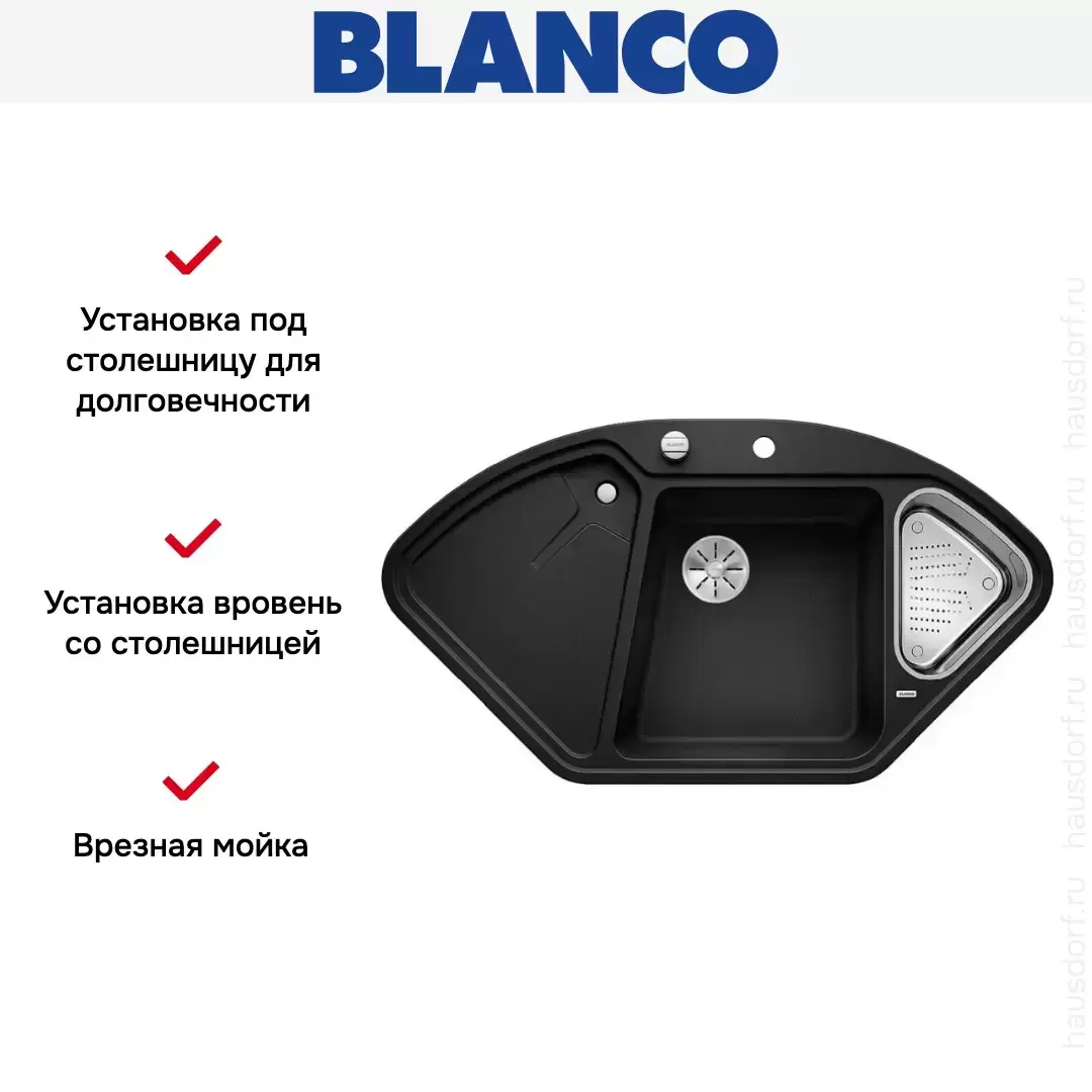 Blanco DELTA II-F SILGRANIT — угловая гранитная мойка, предназначенная для установки в один уровень со столешницей. Трапецивидная форма основной чаши облегчает мытье крупногабаритных предметов посуды. Перфорированный коландер из нержавеющей стали, входящий в комплект поставки модели, оптимально подходит для ополаскивания зелени или разморозки продуктов.