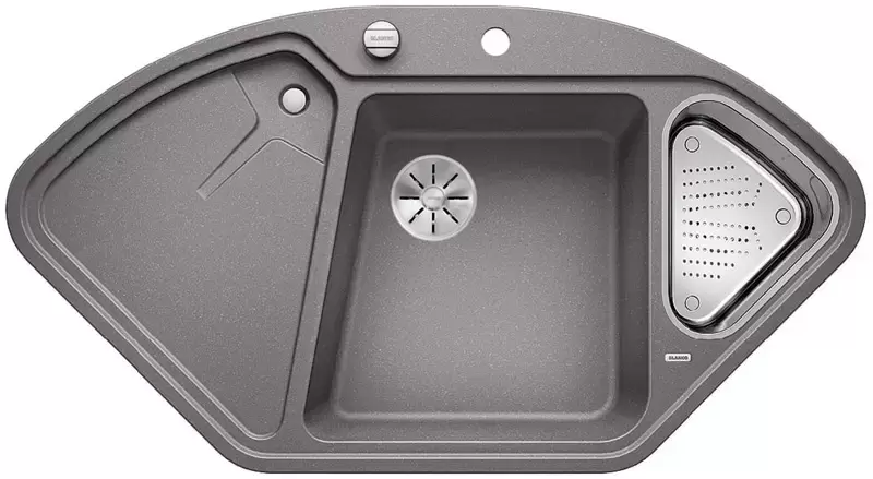 Blanco DELTA II SILGRANIT — практичная угловая мойка из силгранита. Просторное крыло с углубленным донцем может использоваться для высушивания тарелок, а также ополаскивания фруктов, овощей и зелени. Дополнительная чаша модели укомплектована перфорированным коландером из нержавеющей стали.