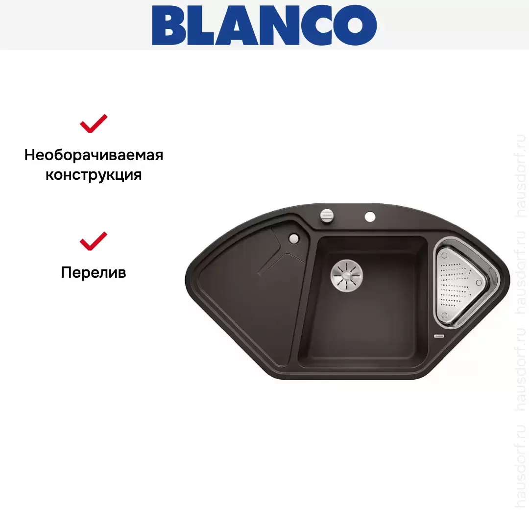 Blanco DELTA II SILGRANIT — практичная угловая мойка из силгранита. Просторное крыло с углубленным донцем может использоваться для высушивания тарелок, а также ополаскивания фруктов, овощей и зелени. Дополнительная чаша модели укомплектована перфорированным коландером из нержавеющей стали.