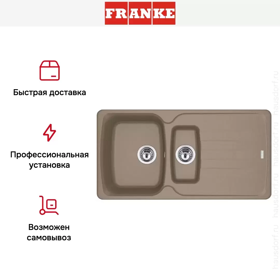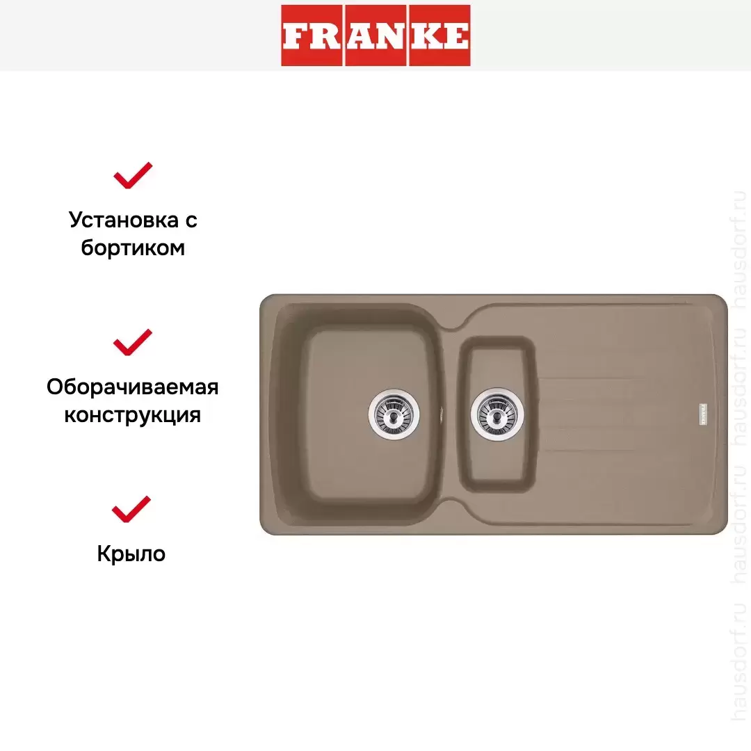 Накладная мойка Franke — отличный выбор для тех, кто хочет создать гармоничное пространство с удобной сантехникой. простой в установке. Преимущество такой конструкции: легко подобрать практически к любой кухне и не придется демонтировать вместе с тумбой при ремонте или перестановке остальной мебели. Данная модель имеет стандартную форму, поэтому подходит большинству пользователей. Устанавливается над столешницей: это самый простой способ монтажа, зачастую с ним можно справиться даже без специалистов, главное — правильно рассчитать размеры ниши.
