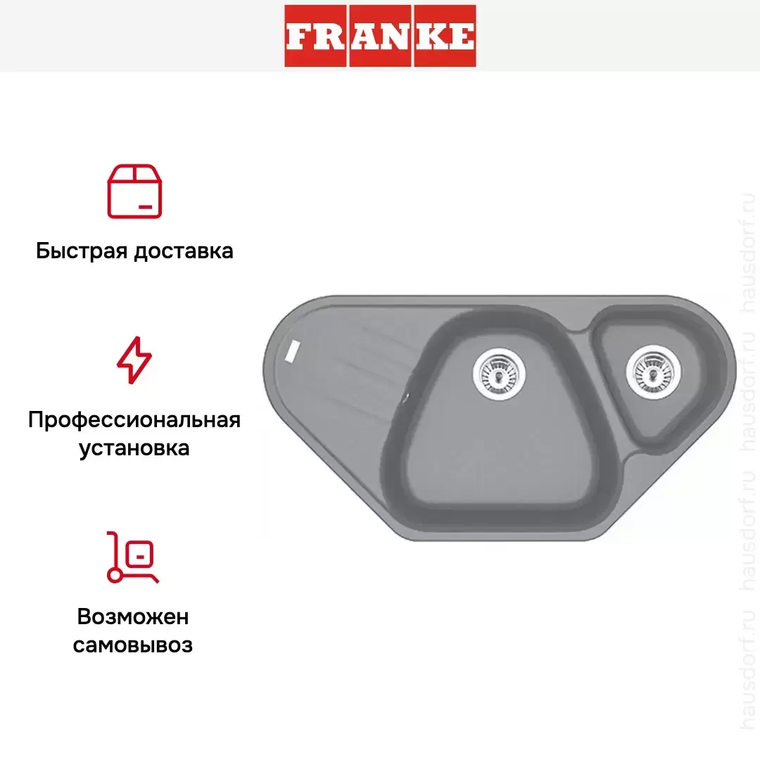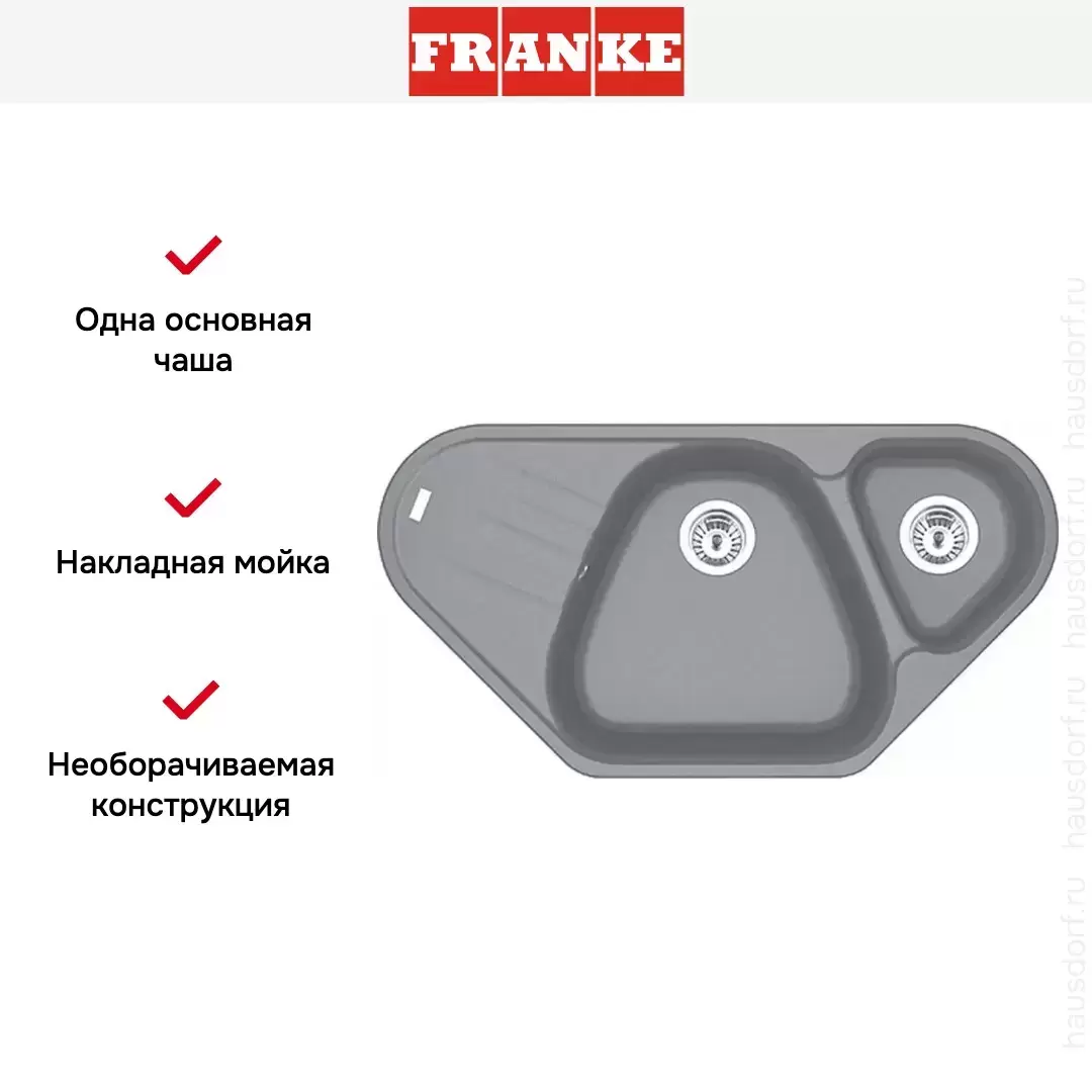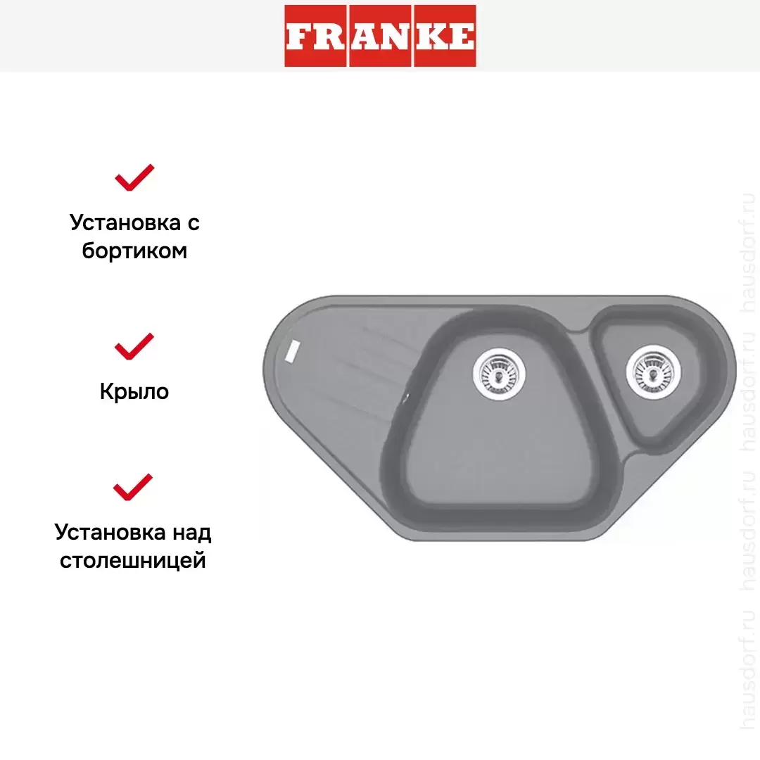 Накладная мойка Franke — отличный выбор для тех, кто хочет создать гармоничное пространство с удобной сантехникой. простой в установке. Преимущество такой конструкции: легко подобрать практически к любой кухне и не придется демонтировать вместе с тумбой при ремонте или перестановке остальной мебели. Данная модель имеет нестандартную форму, поэтому выбор тумбочки для нее потребует дополнительного внимания. Она подойдет для придания интерьеру индивидуальности или решения неочевидных технических проблем. Устанавливается над столешницей: это самый простой способ монтажа, зачастую с ним можно справиться даже без специалистов, главное — правильно рассчитать размеры ниши.