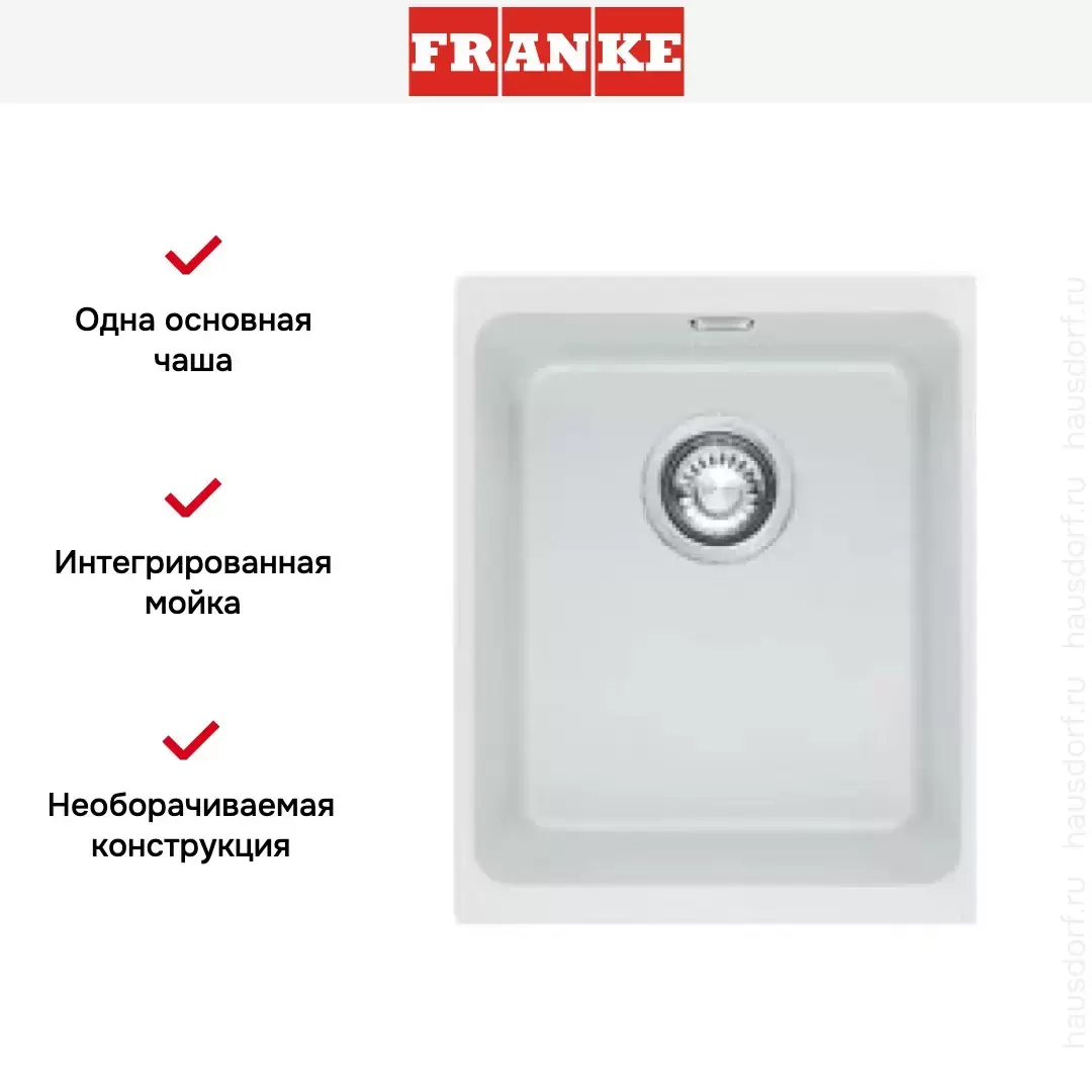 Обратите внимание на дизайнерские отличия мойки Франке, которые помогут в создании идеальной кухни в вашем доме. Она выполнена в цвете белый. Основной материал — фрагранит, он гарантирует надежность и долгие годы службы без повреждений.