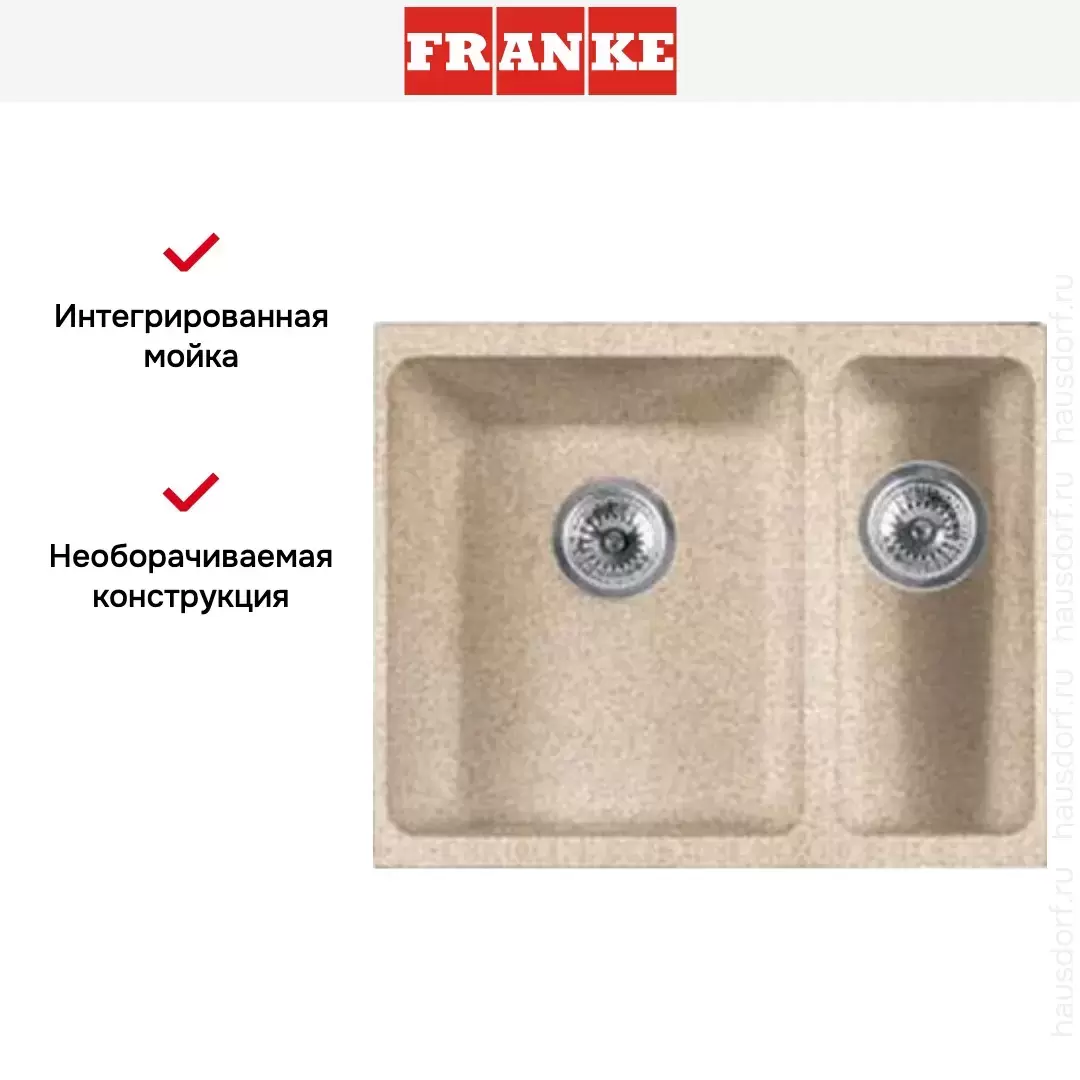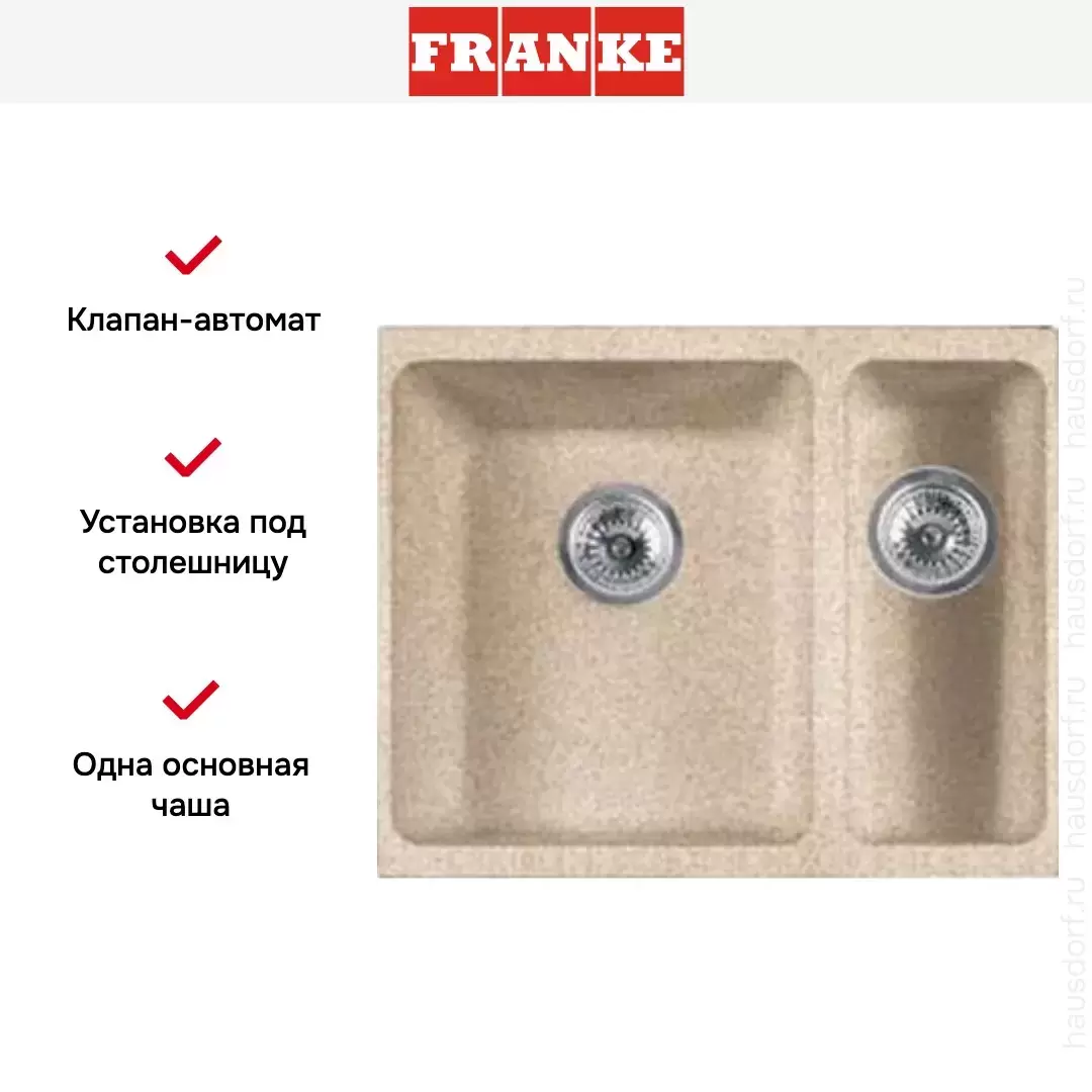 Обратите внимание на дизайнерские отличия мойки Франке, которые помогут в создании идеальной кухни в вашем доме. Она выполнена в цвете бежевый. Основной материал — фрагранит, он гарантирует надежность и долгие годы службы без повреждений.