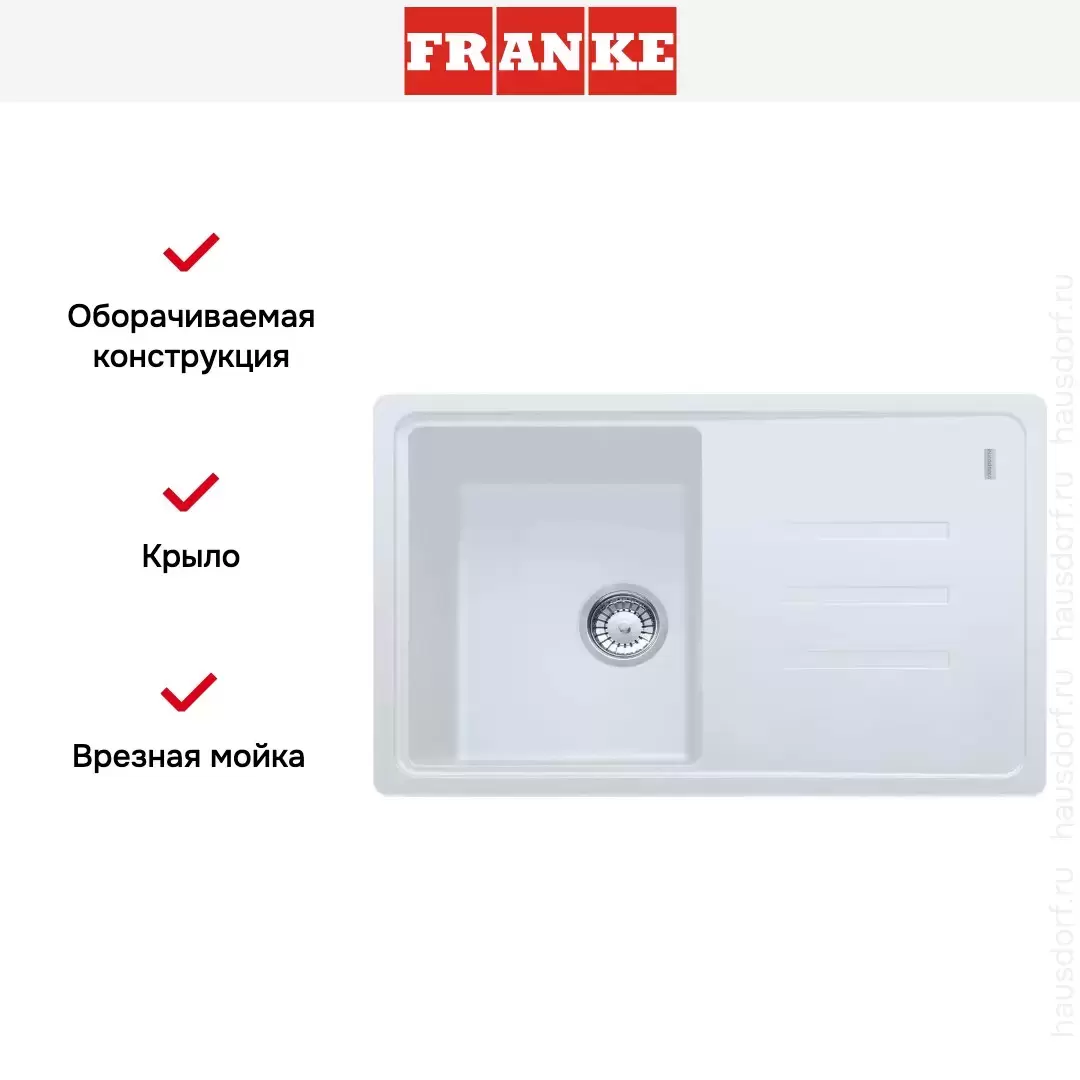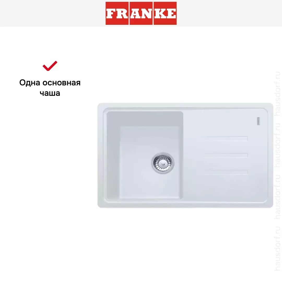 Обратите внимание на дизайнерские отличия мойки Франке, которые помогут в создании идеальной кухни в вашем доме. Она выполнена в цвете белый. Основной материал — фрагранит, он гарантирует надежность и долгие годы службы без повреждений. Крыло, расположенное слева или справа, является дополнительным рабочим пространством, на котором можно сушить посуду, разделывать мясо и нарезать овощи.
