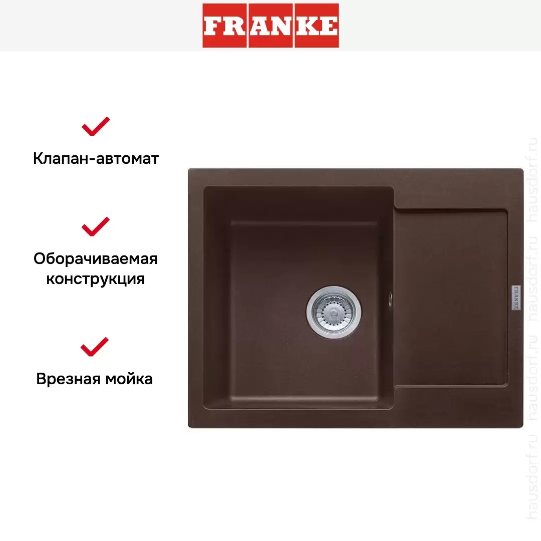 Обратите внимание на дизайнерские отличия мойки Франке, которые помогут в создании идеальной кухни в вашем доме. Она выполнена в цвете шоколад. Основной материал — фрагранит, он гарантирует надежность и долгие годы службы без повреждений. Крыло, расположенное слева или справа, является дополнительным рабочим пространством, на котором можно сушить посуду, разделывать мясо и нарезать овощи.