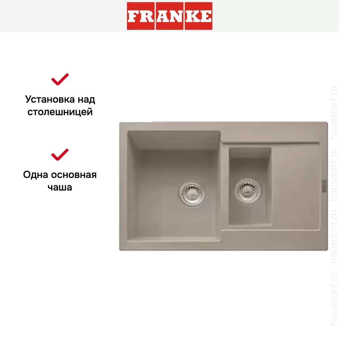 Накладная мойка Franke — отличный выбор для тех, кто хочет создать гармоничное пространство с удобной сантехникой. простой в установке. Преимущество такой конструкции: легко подобрать практически к любой кухне и не придется демонтировать вместе с тумбой при ремонте или перестановке остальной мебели. Данная модель имеет стандартную форму, поэтому подходит большинству пользователей. Устанавливается над столешницей: это самый простой способ монтажа, зачастую с ним можно справиться даже без специалистов, главное — правильно рассчитать размеры ниши.