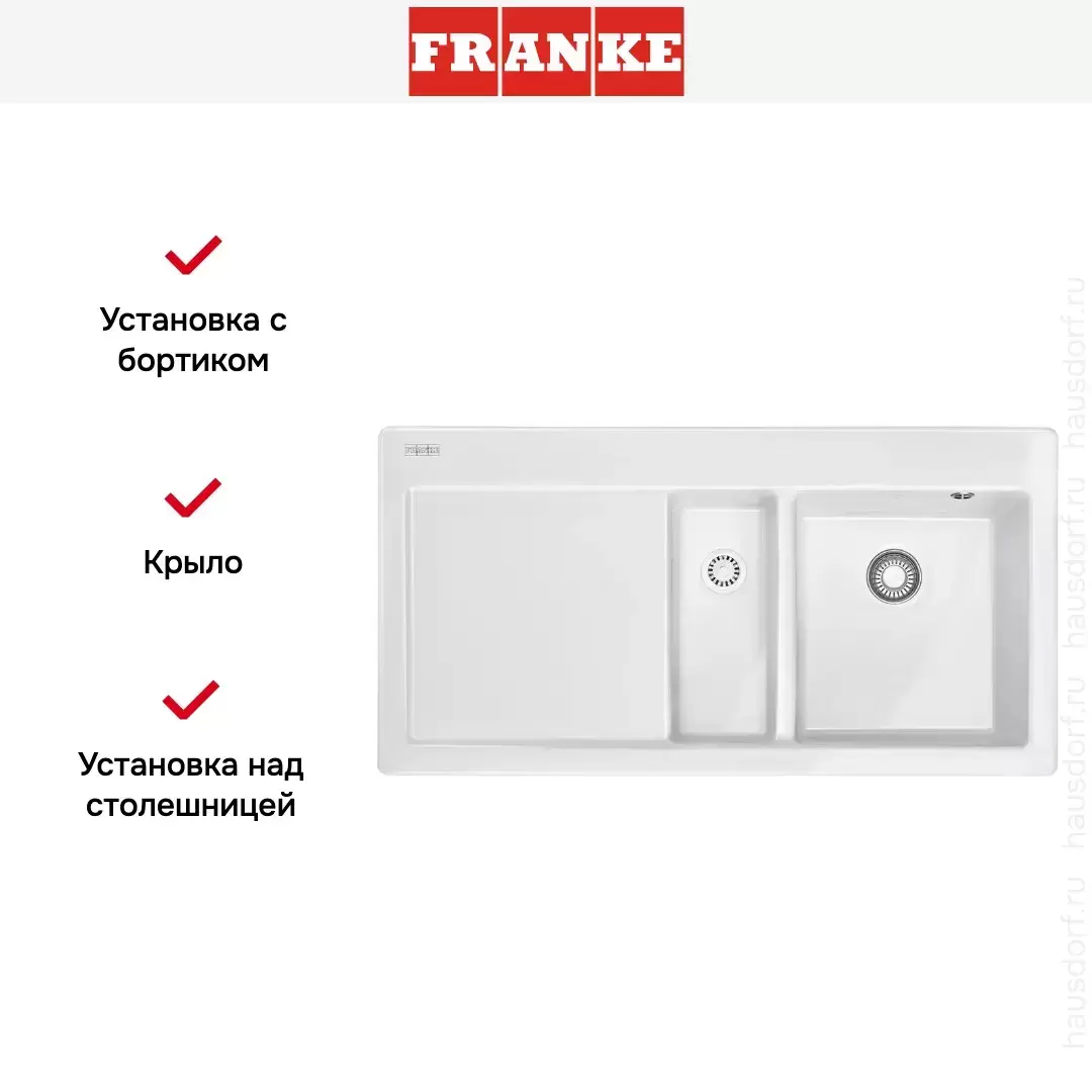 Накладная мойка Franke — отличный выбор для тех, кто хочет создать гармоничное пространство с удобной сантехникой. простой в установке. Преимущество такой конструкции: легко подобрать практически к любой кухне и не придется демонтировать вместе с тумбой при ремонте или перестановке остальной мебели. Данная модель имеет стандартную форму, поэтому подходит большинству пользователей. Устанавливается над столешницей: это самый простой способ монтажа, зачастую с ним можно справиться даже без специалистов, главное — правильно рассчитать размеры ниши.