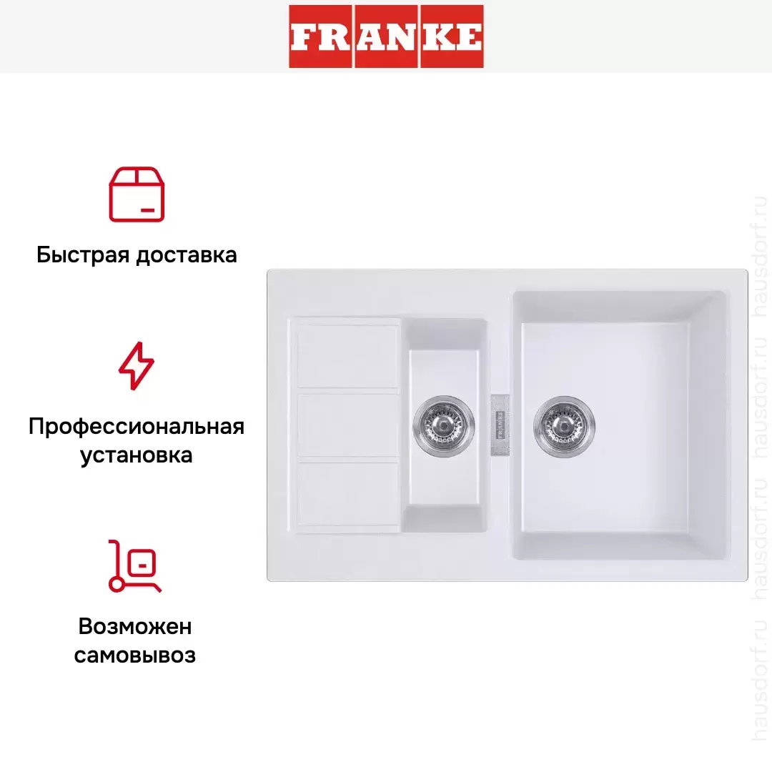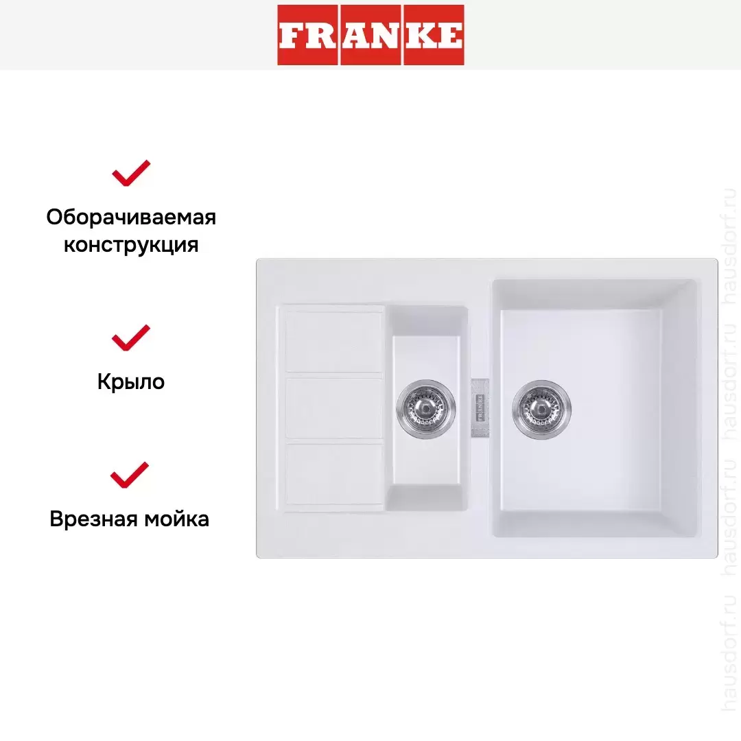 Обратите внимание на дизайнерские отличия мойки Франке, которые помогут в создании идеальной кухни в вашем доме. Она выполнена в цвете белый. Крыло, расположенное слева или справа, является дополнительным рабочим пространством, на котором можно сушить посуду, разделывать мясо и нарезать овощи.