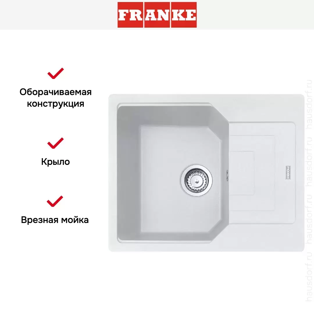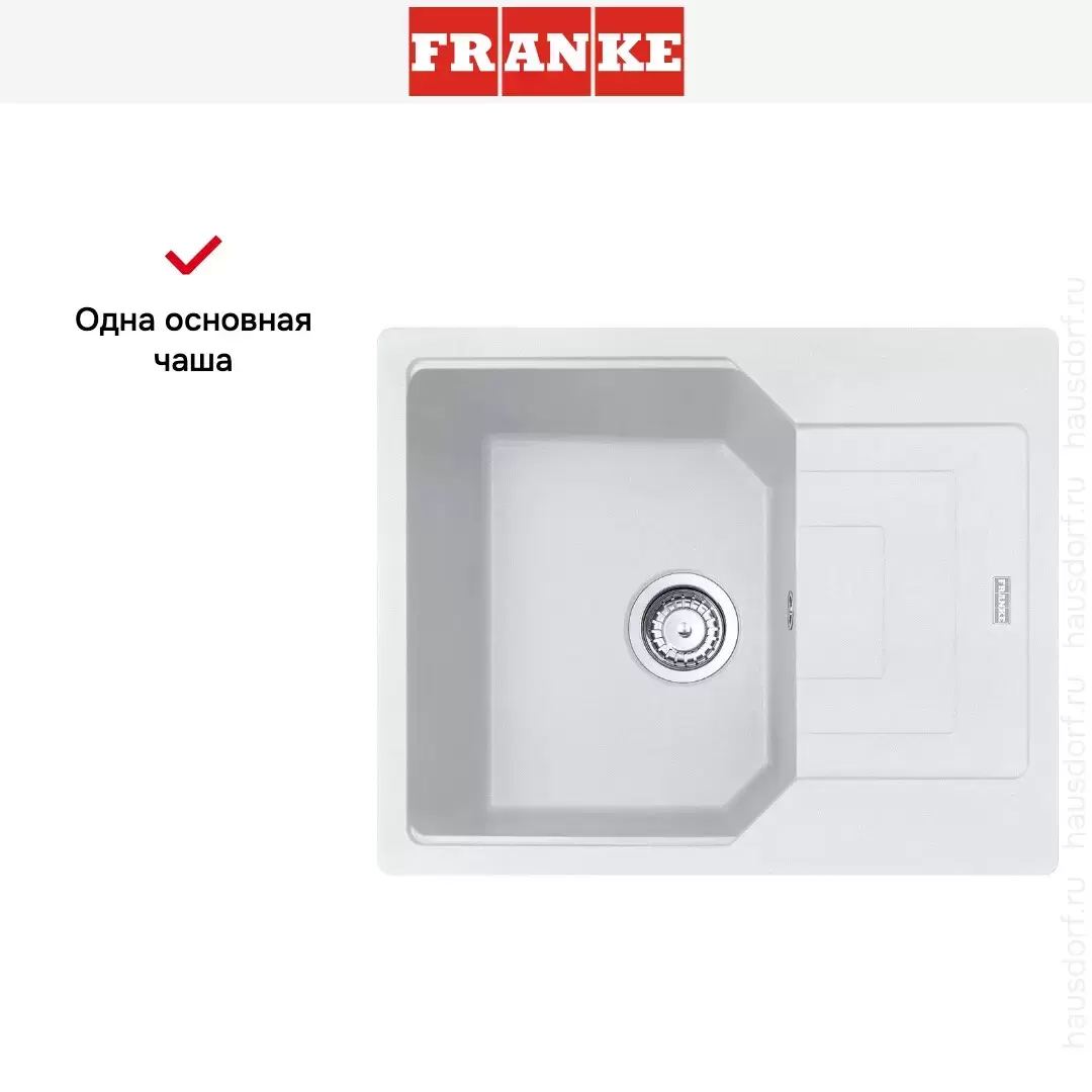 Обратите внимание на дизайнерские отличия мойки Франке, которые помогут в создании идеальной кухни в вашем доме. Она выполнена в цвете белый. Основной материал — фрагранит, он гарантирует надежность и долгие годы службы без повреждений. Крыло, расположенное слева или справа, является дополнительным рабочим пространством, на котором можно сушить посуду, разделывать мясо и нарезать овощи.
