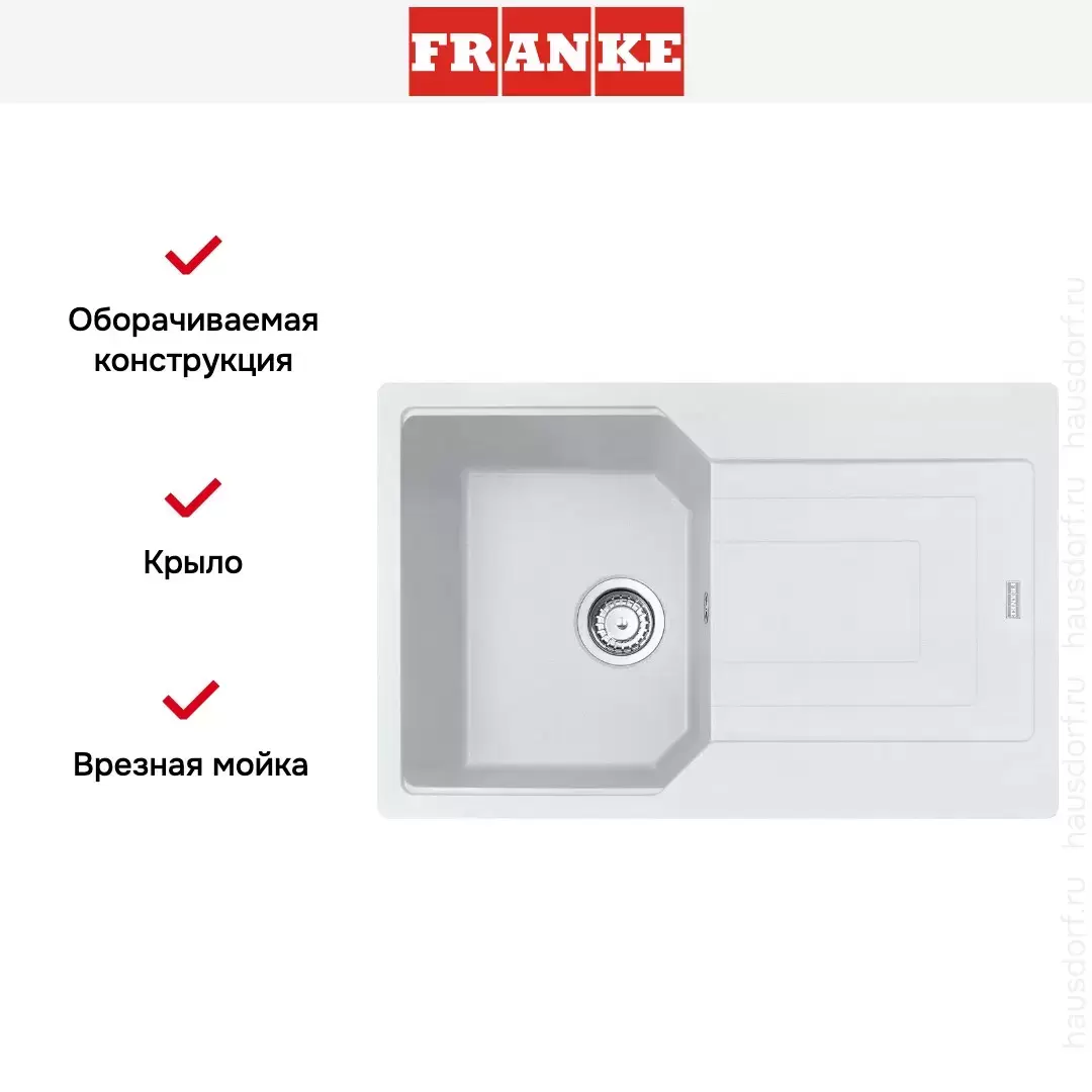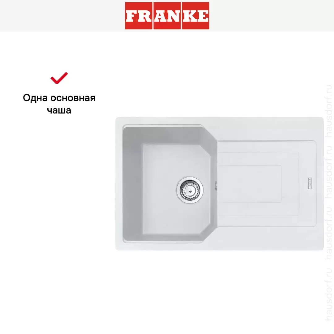 Обратите внимание на дизайнерские отличия мойки Франке, которые помогут в создании идеальной кухни в вашем доме. Она выполнена в цвете белый. Основной материал — фрагранит, он гарантирует надежность и долгие годы службы без повреждений. Крыло, расположенное слева или справа, является дополнительным рабочим пространством, на котором можно сушить посуду, разделывать мясо и нарезать овощи.