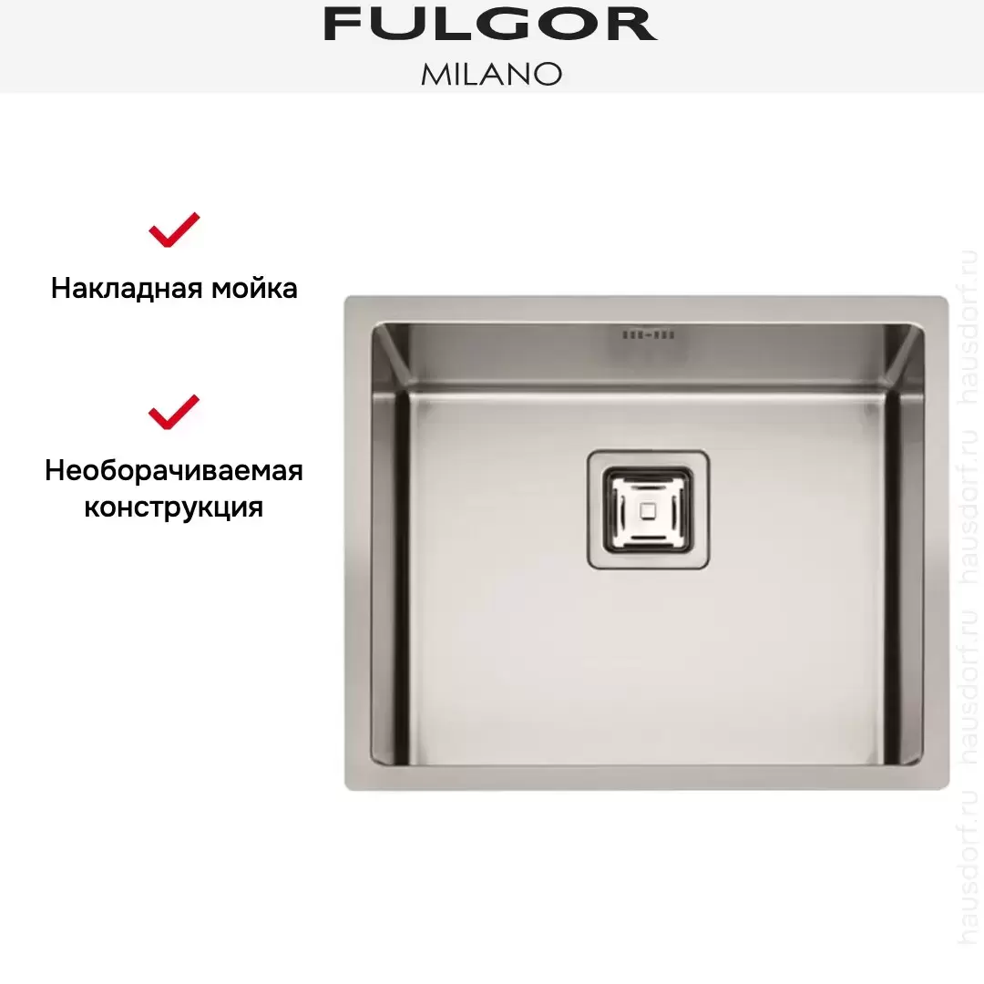 Необорачиваемая мойка Fulgor Milano  P1B 5545 Q F-SF представлена в цвете нержавеющей стали. Эргономичный корпус позволяет комфортно интегрировать модель вровень со столешницей или над ней. Глубокая чаша исключает перелив воды за пределы рабочей зоны.