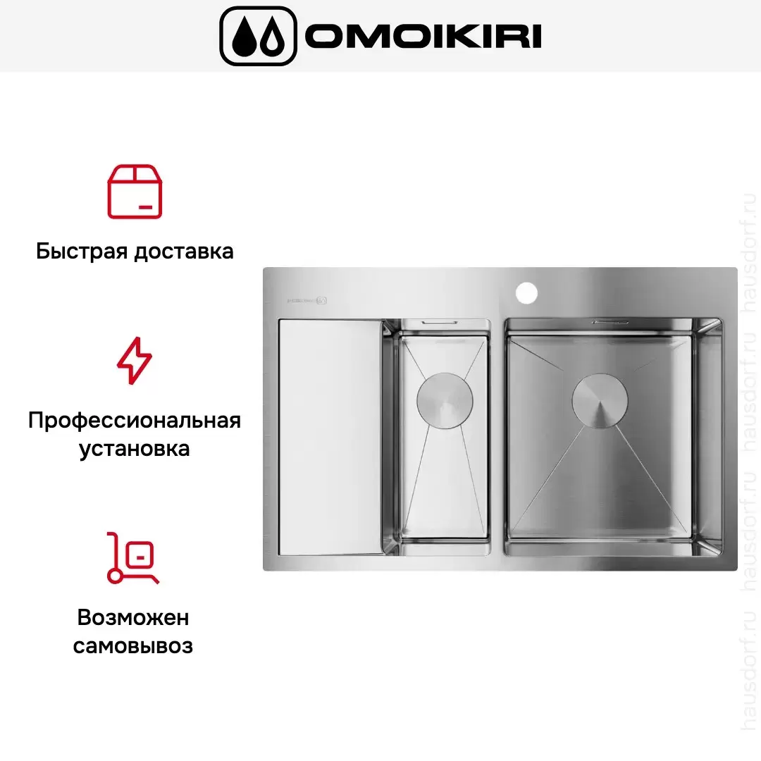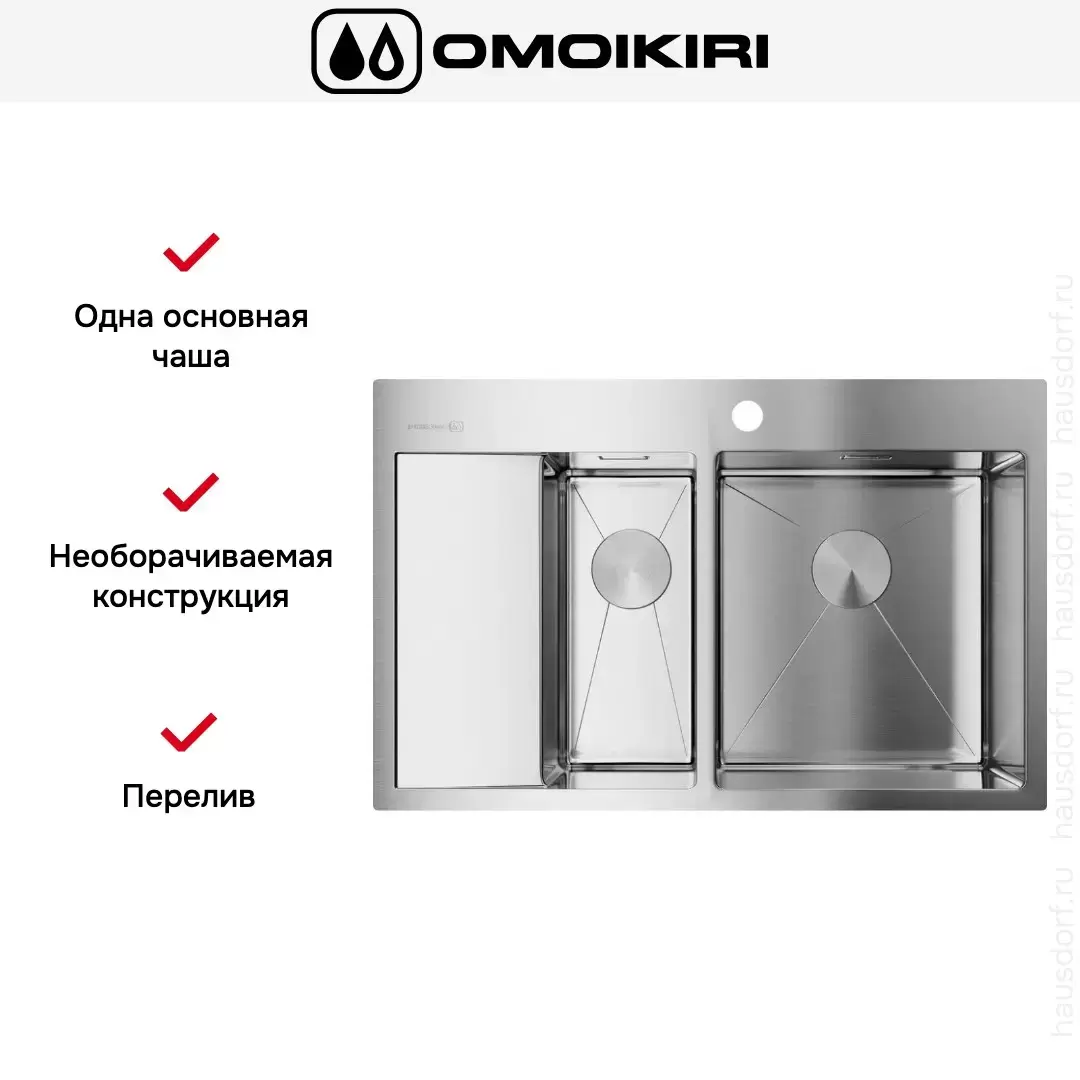 Врезная мойка Omoikiri — отличный выбор для тех, кто хочет создать гармоничное кухонное пространство с полностью вписывающейся в него сантехникой. Преимущество такой конструкции — плотное прилегание к столешнице, так как вырез подбирается индивидуально под габариты модели. Под стыки не попадает вода, поэтому срок службы значительно увеличивается, пользоваться ей удобно и приятно. Данная модель имеет стандартную форму, поэтому подходит большинству пользователей. Устанавливается над столешницей: это самый простой способ монтажа, зачастую с ним можно справиться даже без специалистов, главное — правильно рассчитать размеры ниши.