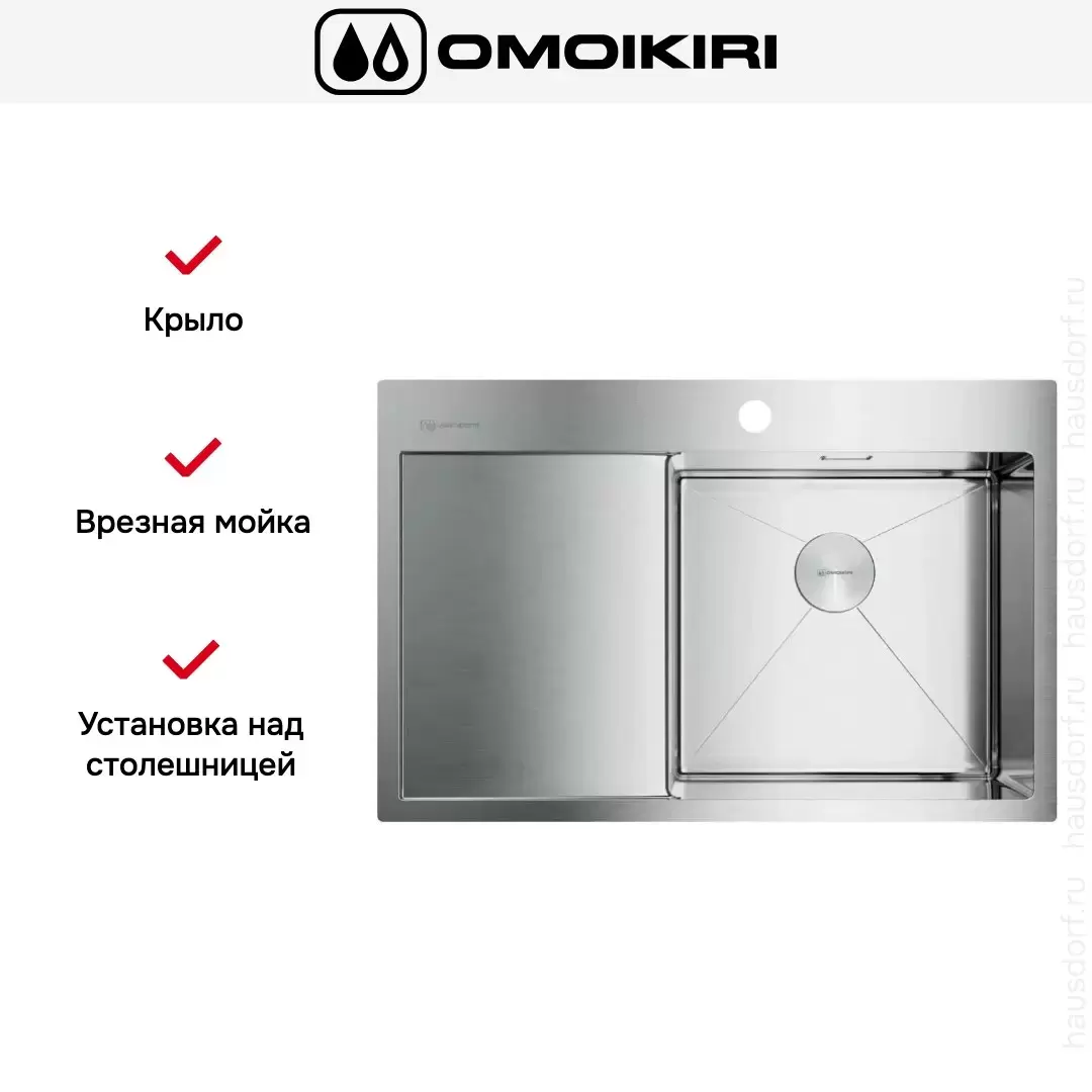 Врезная мойка Omoikiri — отличный выбор для тех, кто хочет создать гармоничное кухонное пространство с полностью вписывающейся в него сантехникой. Преимущество такой конструкции — плотное прилегание к столешнице, так как вырез подбирается индивидуально под габариты модели. Под стыки не попадает вода, поэтому срок службы значительно увеличивается, пользоваться ей удобно и приятно. Данная модель имеет стандартную форму, поэтому подходит большинству пользователей. Устанавливается над столешницей: это самый простой способ монтажа, зачастую с ним можно справиться даже без специалистов, главное — правильно рассчитать размеры ниши.