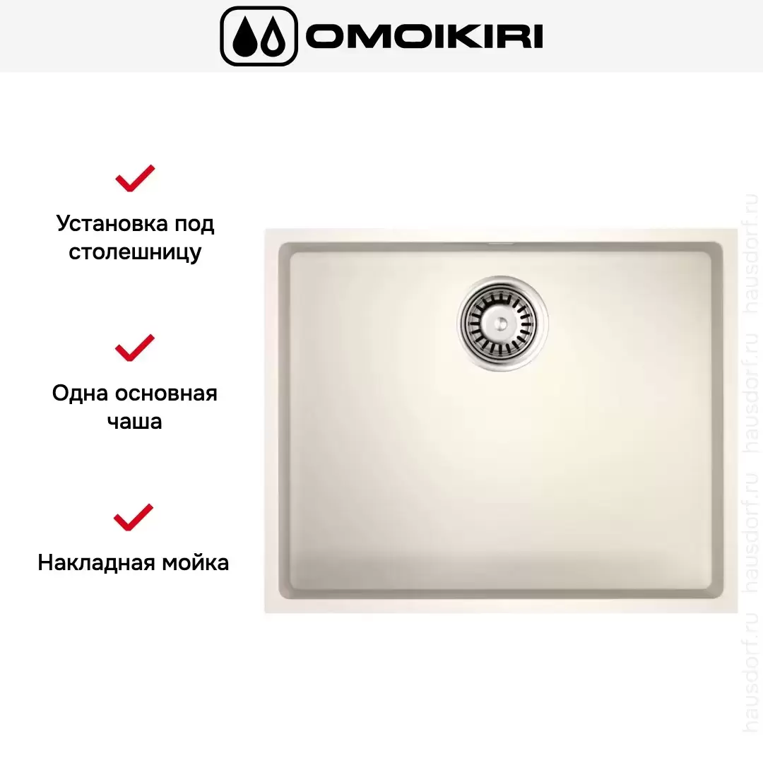 Накладная мойка Omoikiri — отличный выбор для тех, кто хочет создать гармоничное пространство с удобной сантехникой. простой в установке. Преимущество такой конструкции: легко подобрать практически к любой кухне и не придется демонтировать вместе с тумбой при ремонте или перестановке остальной мебели. Данная модель имеет стандартную форму, поэтому подходит большинству пользователей. Устанавливается под столешницу, благодаря чему не остается стыков, в которых копились бы загрязнения, а также увеличивается рабочая глубина.