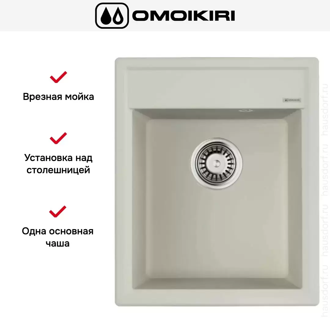 Врезная мойка Omoikiri — отличный выбор для тех, кто хочет создать гармоничное кухонное пространство с полностью вписывающейся в него сантехникой. Преимущество такой конструкции — плотное прилегание к столешнице, так как вырез подбирается индивидуально под габариты модели. Под стыки не попадает вода, поэтому срок службы значительно увеличивается, пользоваться ей удобно и приятно. Данная модель имеет стандартную форму, поэтому подходит большинству пользователей. Устанавливается над столешницей: это самый простой способ монтажа, зачастую с ним можно справиться даже без специалистов, главное — правильно рассчитать размеры ниши.