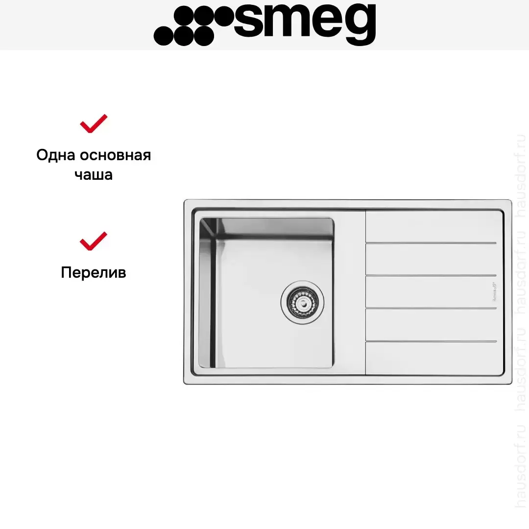 Мойка Smeg LDR861-2 врезного типа из матовой нержавеющей стали имеет прямоугольную форму со скругленными углами и оснащена крылом — то есть горизонтальной поверхностью с желобами-водостоками. Модель с одной чашей является оборачиваемой и может устанавливаться с крылом справа или слева. Глубина чаши составляет 20 см, что позволяет мыть объемную посуду. Для защиты столешницы от воды служит бортик. Мойка Смег LDR861-2 комплектуется уплотнительной лентой и фиксирующими зажимами для легкой установки.