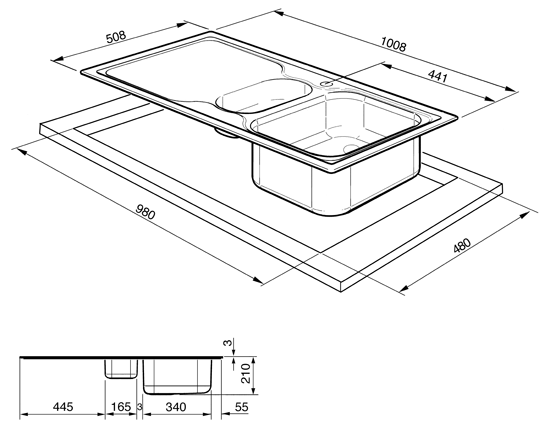 Прямоугольная модель шириной 100 см предназначена для установки вровень со столешницей. Кухонную мебель защищает невысокий бортик. Модель является необорачиваемой — крыло при установке располагается слева. Сифон с возможностью подключения посудомоечной и стиральной машины входит в комплект.
