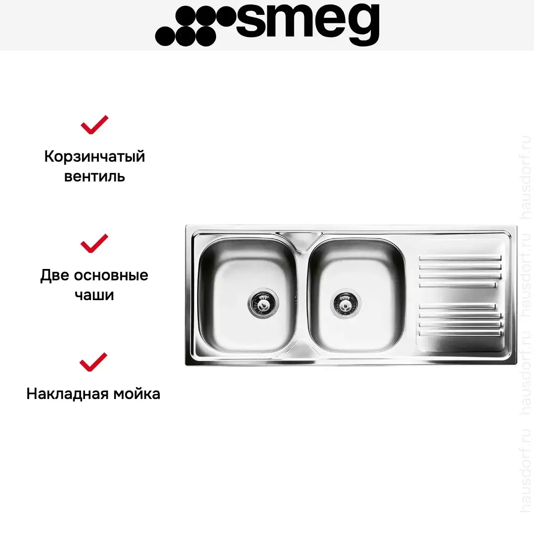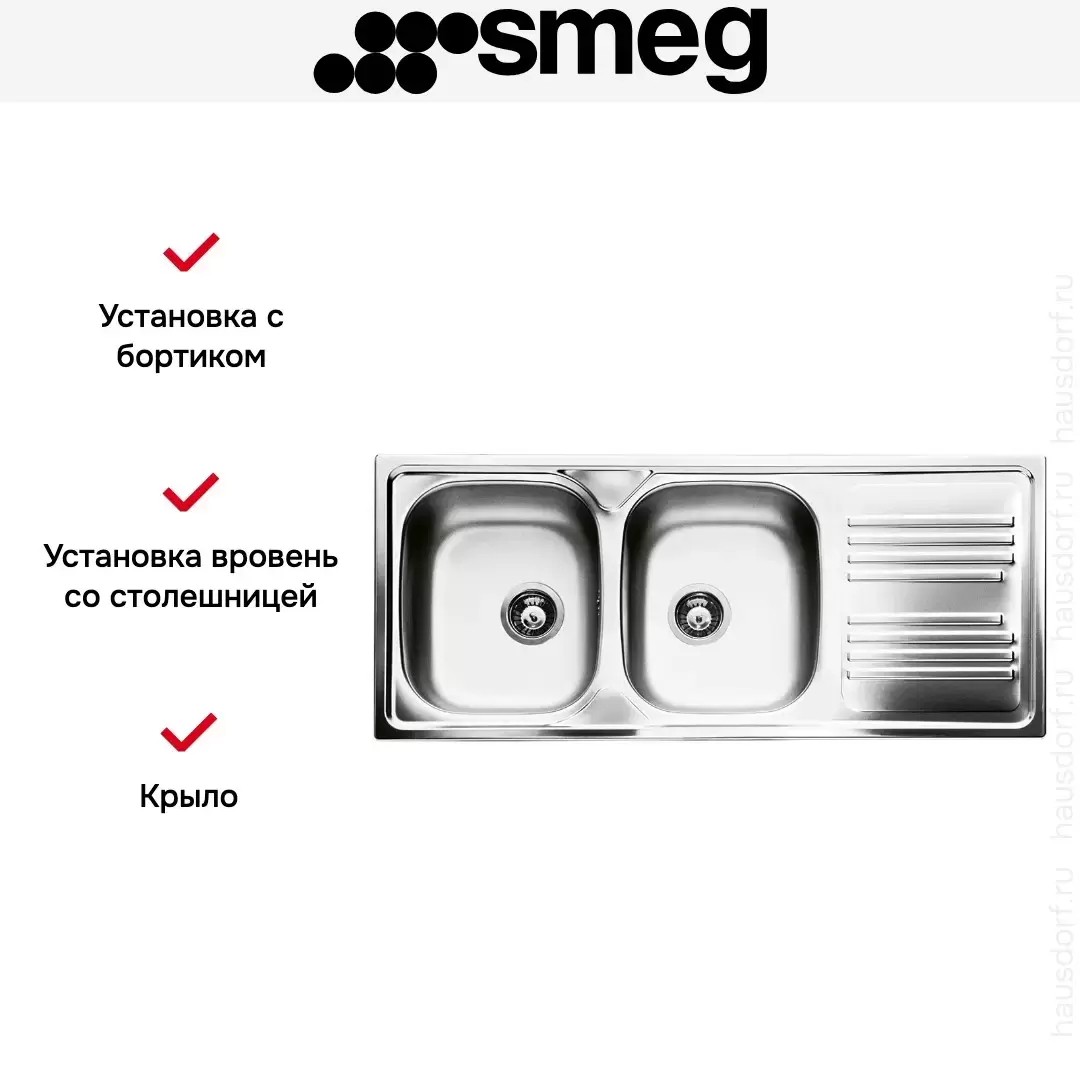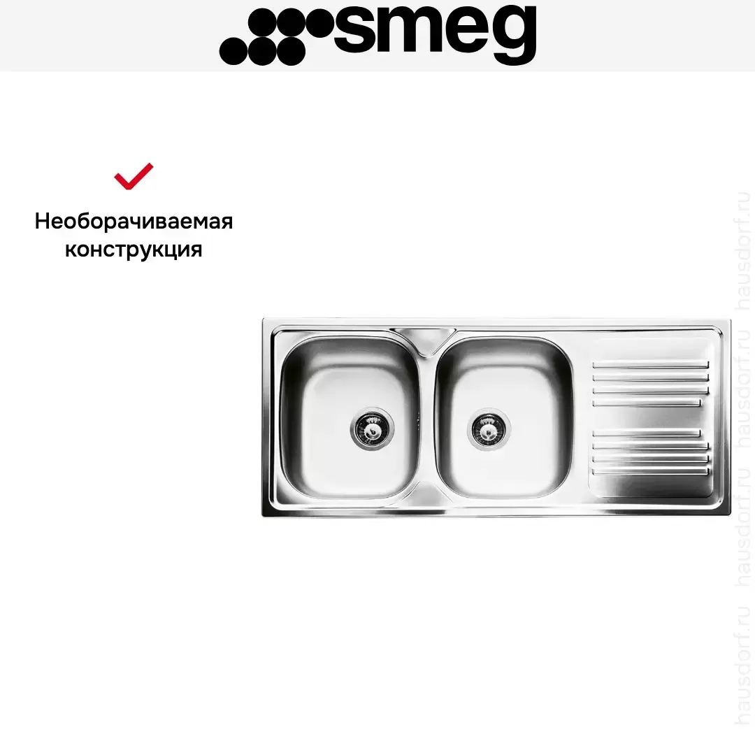 Необорачиваемая прямоугольная мойка Smeg LYP116D сделана из нержавеющей стали, подойдет любому кухонному дизайну. Имеет две чаши глубиной 15 см, сохнущую посуду можно расположить на крыле справа. Мойка соединяется со стиральной или посудомоечной машиной с помощью сифона.
