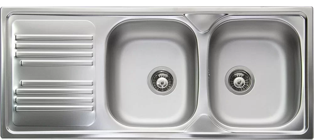 Большая модель шириной 116 см может устанавливаться вровень со столешницей. Прочная нержавеющая сталь толщиной 0,6 мм с матовой текстурой обладает устойчивостью к термическому воздействию и очень проста в очистке. Две одинаковые чаши шириной 33 см со скругленными углами удобны и вместительны.