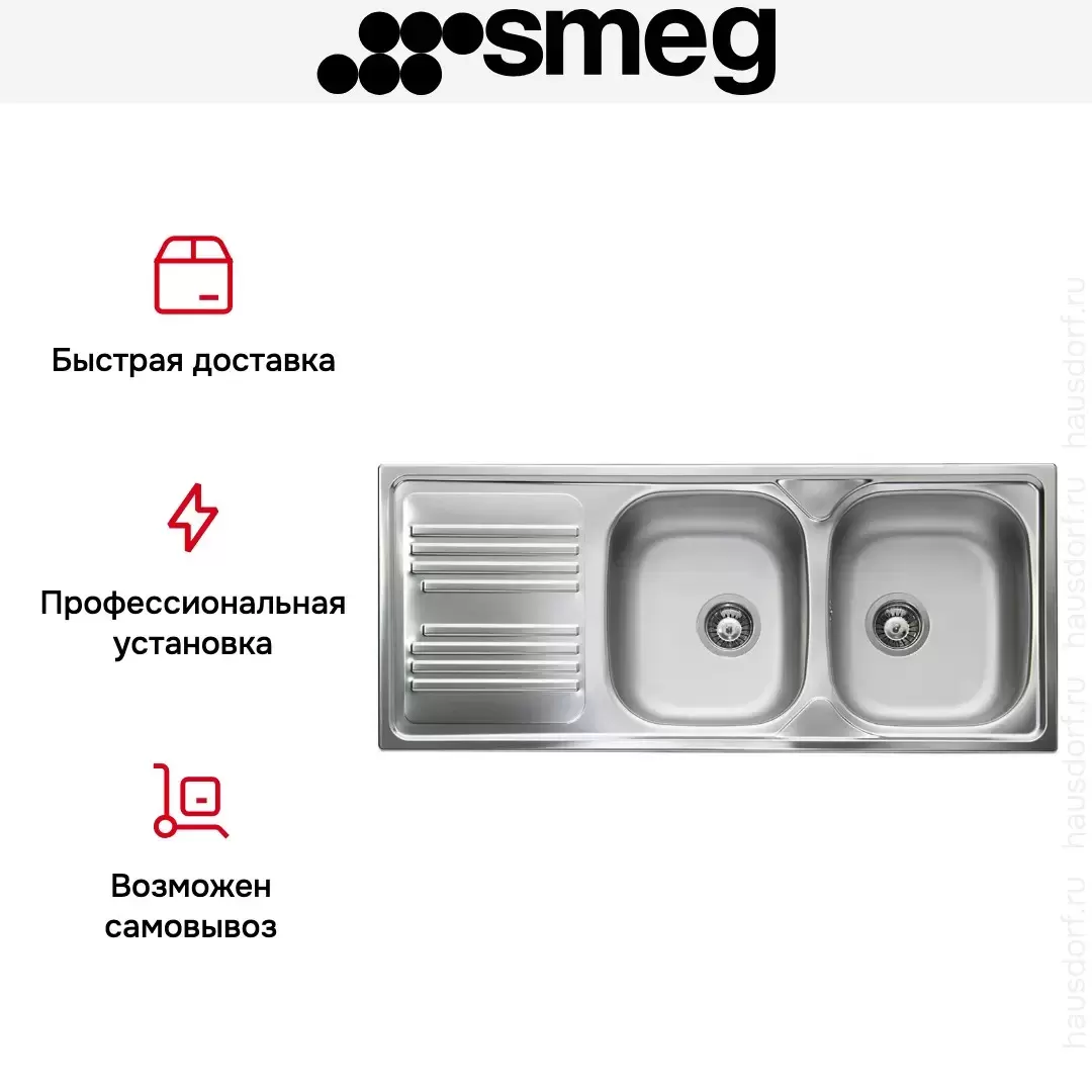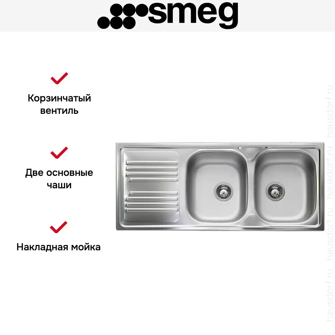 Прямоугольная мойка Smeg LYP116S сделана из нержавеющей стали, подходит любому дизайну кухни. Имеет две чаши глубиной 15 см, слева — крыло, на котором можно расположить сохнущую посуду. Благодаря сифону можно соединить мойку с посудомоечной или стиральной машиной.
