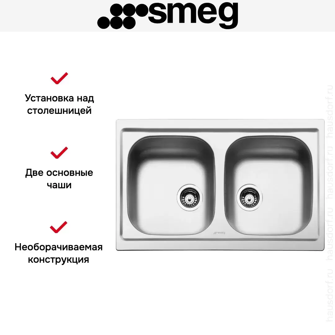 Материалом изготовления необорачиваемой мойки Smeg LYP792 послужила матовая нержавеющей сталь толщиной 0,6 мм. Модель с установкой на столешницу оснащена двумя глубокими чашами одинакового размера — шириной 33 см и глубиной 14,8 см. Установка с бортиком защищает кухонную мебель от попадания воды.