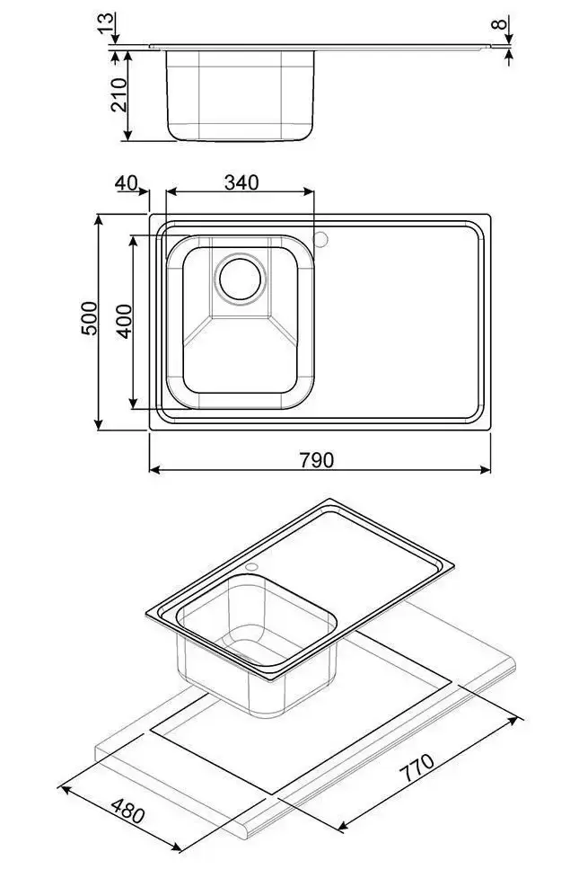 Врезная прямоугольная модель является необорачиваемой: предусмотрено размещение крыла с левой стороны. Установка с бортиком высотой 13 см поможет предохранить столешницу от стекающей воды. Глубина чаши составляет 21 см. Полированная сталь толщиной 0,7 мм удобна и нетребовательна в очистке.
