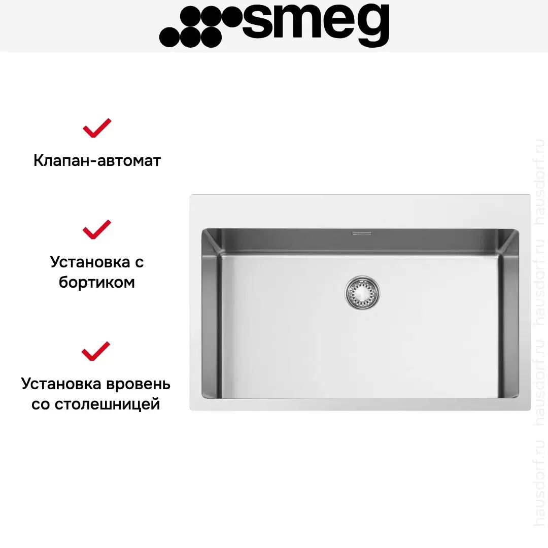 Мойка Smeg VR12S70RS устанавливается вровень со столешницей и имеет прямоугольную форму со скругленными углами. Ее ширина составляет 75 см, а глубина 51 см — такая модель подойдет для просторной кухни. Невысокий бортик предохраняет столешницу от брызг. Глубина чаши 20 см позволит без труда вымыть большие кастрюли или вазы. Перелив предохранит от утечки, даже если кран не будет закрыт вовремя. Мойка Смег VR12S70RS изготовлена из высококачественной нержавеющей стали AISI304 с матовой поверхностью.