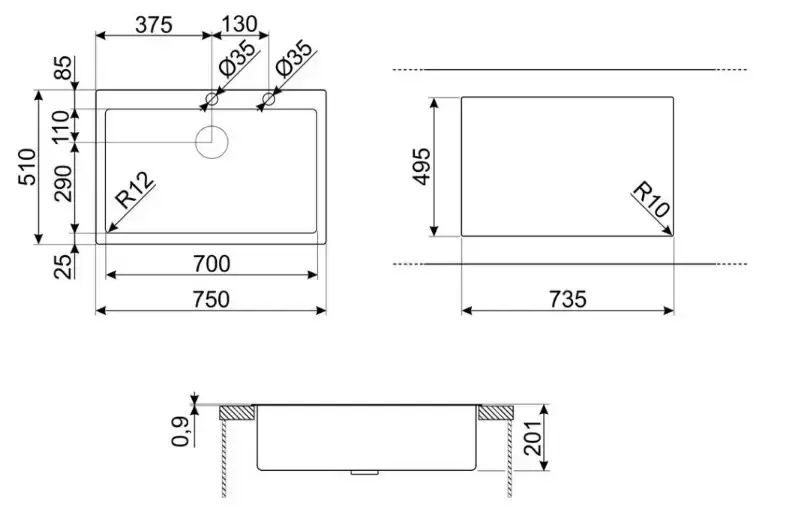 • Два отверстия под смеситель
