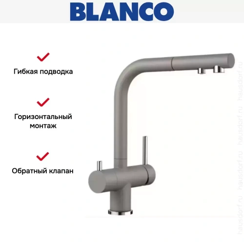 Смеситель Blanco FONTAS-S II SILGRANIT станет отличным дополнением вашей кухни. Прибор обладает двумя шлангами, которые обеспечивают подачу проточной и питьевой воды через разные каналы. Длинный рычаг делает управление намного удобней. Благодаря наличию выдвижного излива вы сможете без особых трудностей помыть посуду больших размеров, а также уборка раковины после окончания мытья станет гораздо легче. Бесшумная работа обеспечивает спокойный и тихий процесс работы. Среди дополнительных преимуществ: