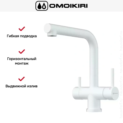 Модель Omoikiri TAKAMATSU-S устанавливается привычным способом: на бортик мойки или ванной в предназначенные для этого отверстия (они могут быть вырезаны производителями заранее, но если нет, при достаточной ширине можно добавить их самостоятельно). Гибкая подводка позволяет расположить сантехнику в любом удобном месте, при этом нужно учитывать несколько важных нюансов: для максимальной надежности лучше выбирать сильфонные рукава, нельзя использовать ее вместо стационарного водопровода, только как соединительный элемент для крана.