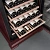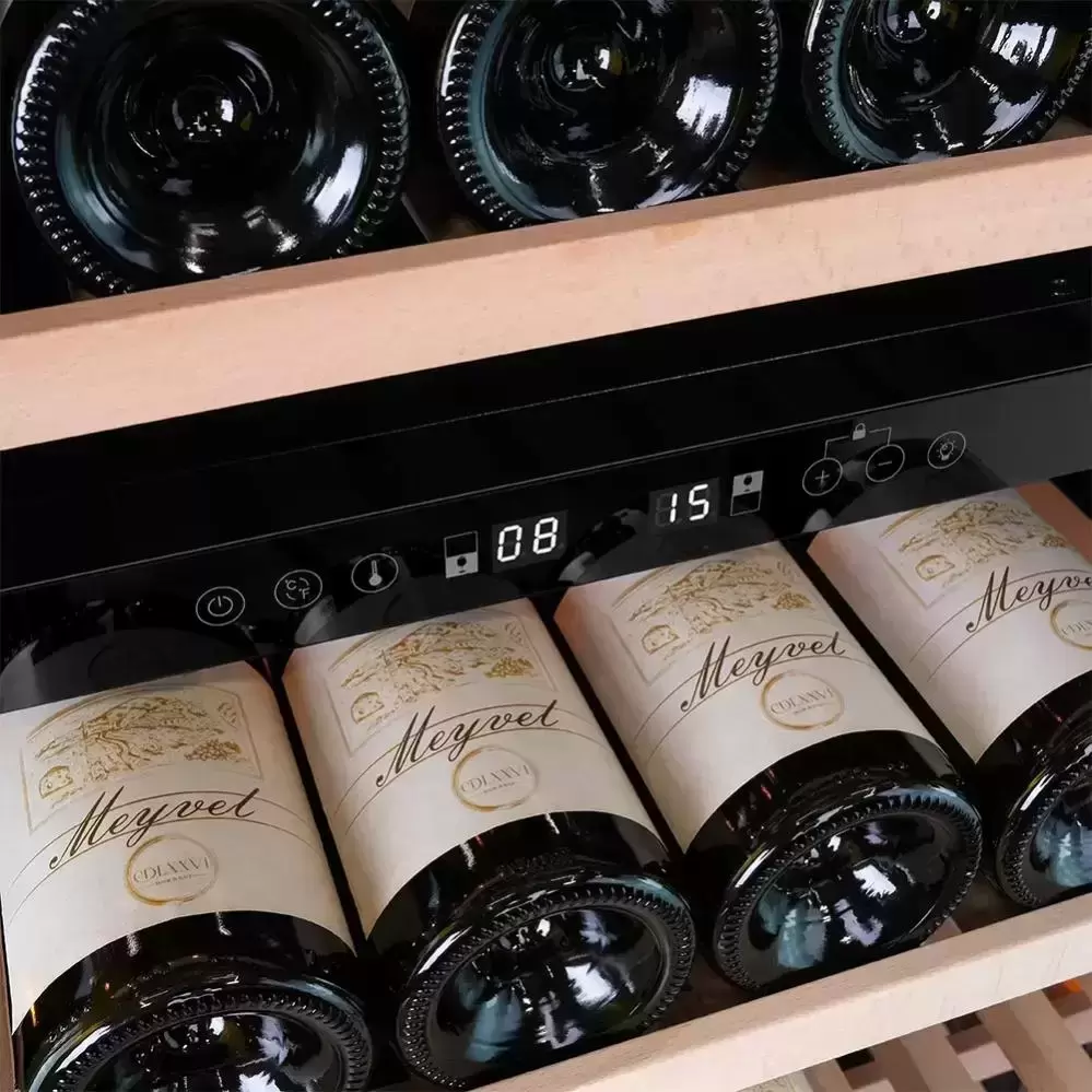 Внутренняя компоновка рассчитана на 99 бутылок объёмом 0,75 л и общий объём 265 литров. Девять выкатных полок из массива бука аккуратно фиксируют бутылки, уменьшают риск контактного повреждения пробок и упрощают доступ к коллекции. Для нестандартных бутылок предусмотрена отдельная полка, а панорамное и демонстрационное освещение с тремя цветами — белым, синим и янтарным — выгодно подчёркивает этикетки и создаёт выставочный эффект.