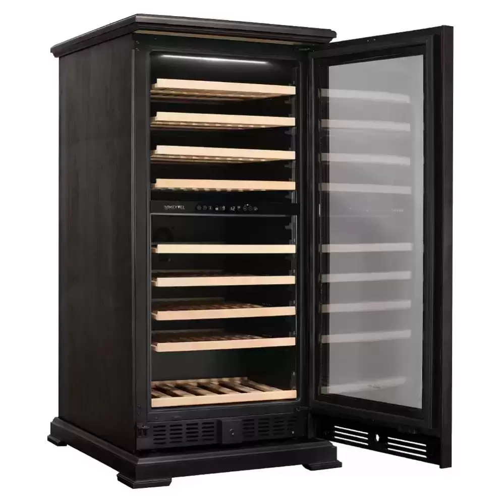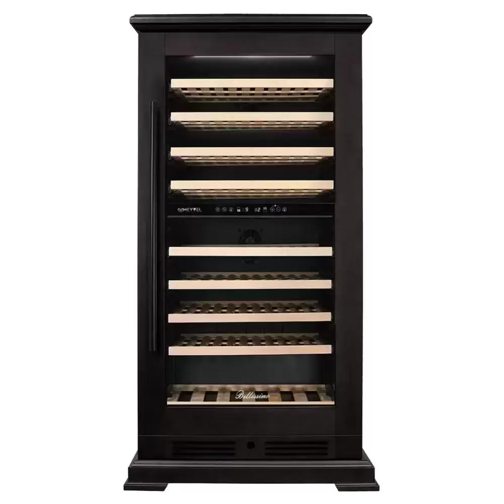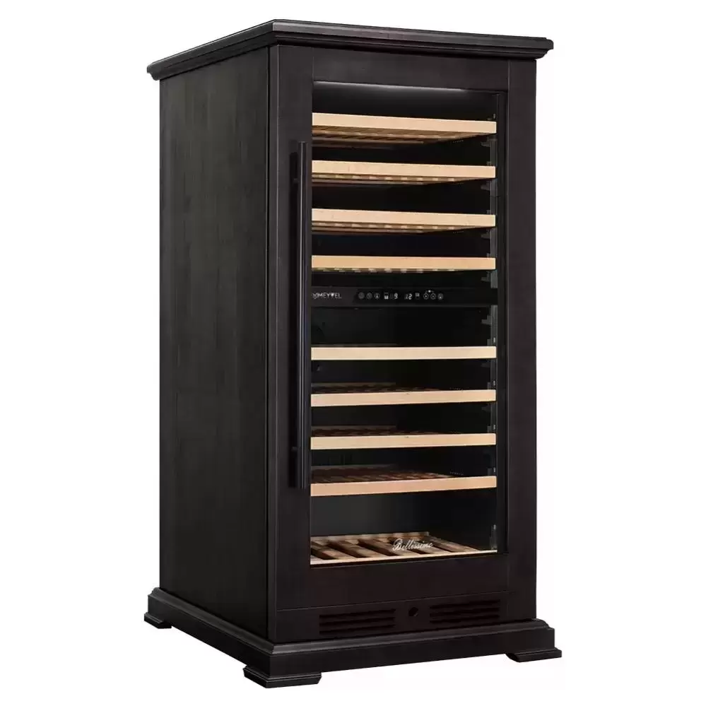 Винный шкаф Meyvel MV99Pro KBT2 — элегантный отдельно стоящий прибор в цвете «тёмный шоколад», сочетающий натуральный шпон бука и сталь для премиального внешнего вида. Дверь со стеклопакетом в три слоя имеет тонировку и защиту от УФ‑излучения, что сохраняет содержимое от светового старения и делает корпус достойным элементом интерьера. Накладная чёрная ручка и правый дверной упор подчёркивают строгий стиль, а размеры позволяют установить прибор в кухонной зоне, в баре или в домашней винной комнате.