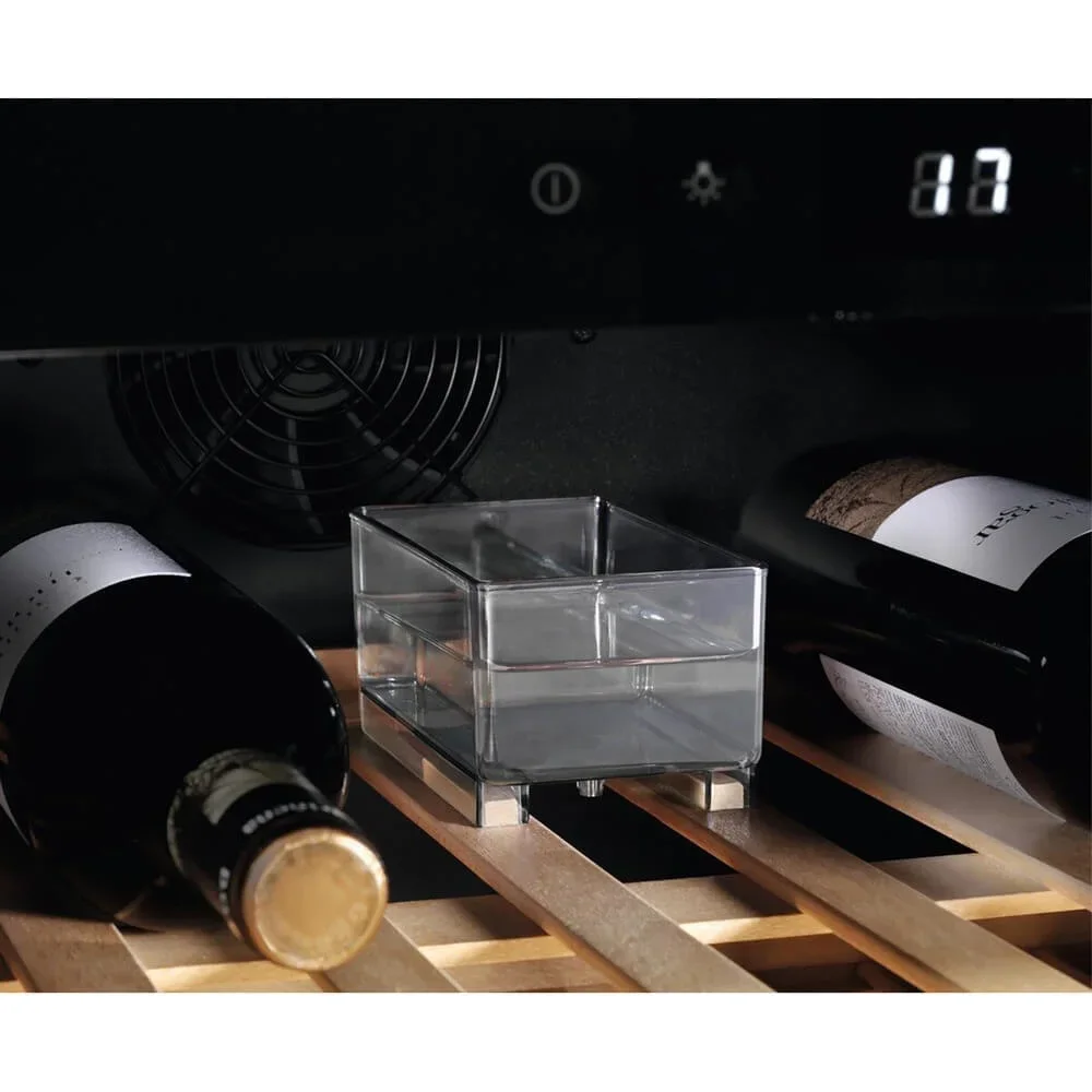 Управление сенсорное с LED-дисплеем, интуитивно понятное и точное, позволяет быстро задать желаемую температуру. Внутреннее светодиодное освещение деликатно подсвечивает бутылки без нагрева, а вентиляция обеспечивает обмен воздуха при встраивании холодильника в мебель. Наличие резервуара для воды помогает поддерживать необходимую влажность внутри корпуса, что важно для сохранения эластичности пробок и предотвращения их усыхания. Корпус работает тихо — уровень шума около 45 дБ — и потребляет немного электроэнергии по классу A.