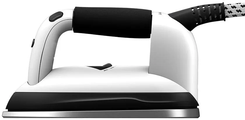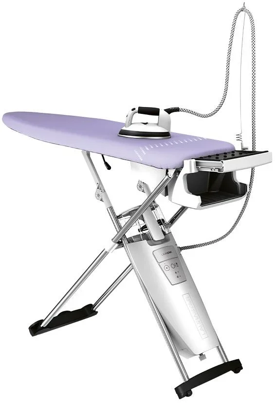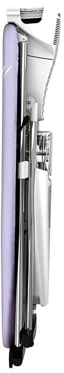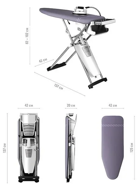 Дизайн сочетает прочный пластиковый корпус и шлифованную алюминиевую подошву утюга. Плавные линии и прорезиненная ручка обеспечивают удобный захват. Система складывается и занимает в сложенном виде всего 137×42×20 см, что упрощает хранение в шкафу или кладовой. Колесики и встроенный кейс для утюга облегчают перемещение по квартире.
