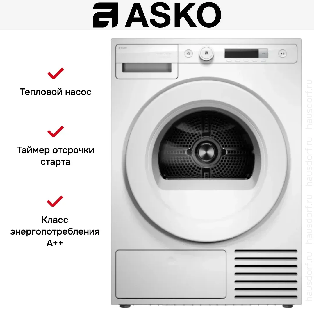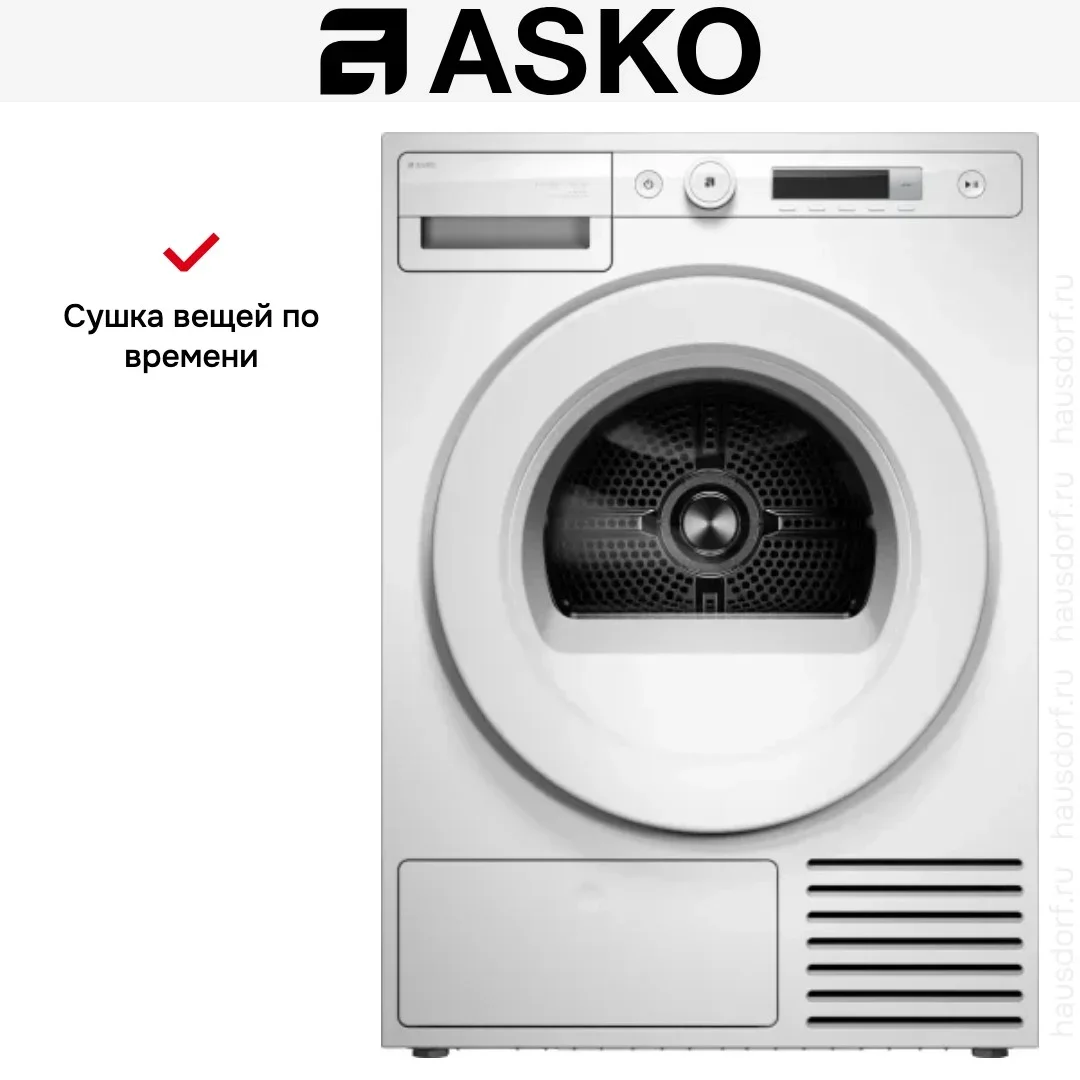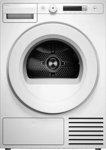 Сушильная машина ASKO T108HBW представлена в классическом белом корпусе, который гармонирует с любой кухонной или прачечной мебелью. Отдельностоящий прибор с тепловым насосом экономно расходует энергию (класс A++), среднегодовой показатель — 235 кВт·ч. Объём барабана 117 л и загрузка до 8 кг позволяют быстро обработать бельё, включая постельные комплекты, деликатные ткани и синтетику. Панель управления расположена горизонтально, оснащена кнопками и дисплеем с индикацией оставшегося времени, есть настройка степени высушивания, таймер отсрочки старта и звуковой сигнал по окончании цикла. Барабан Soft Drum изготовлен из нержавеющей стали, как и бак; конструкция дверцы — круглая, с правым навесом и возможностью перенавешивания, украшена стеклом. Устройство поддерживает десять режимов, в том числе шелк, шерсть, проветривание, режимы «под утюг», сушка по времени и постельное бельё. Есть подключение слива к канализации и ёмкость для сбора конденсата, лопасти Butterfly™ повышают эффективность рециркуляции воздуха. Вес 53,8 кг.