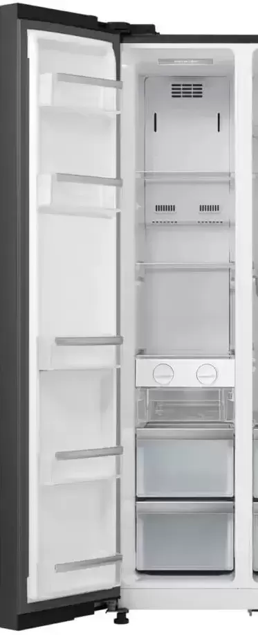 Korting KNFS 91797 GN — отдельно стоящий холодильник Side-By-Side высотой 179 см и шириной 90 см для большой семьи или для создания большого запаса продуктов. Морозильная камера расположена слева. Общий объем этой модели с фасадом из стекла черного цвета составляет 500 литров, объем морозильной камеры равен 175 литров. В обоих отделениях используется система размораживания No Frost, что исключает намерзание льда на стенках камер.