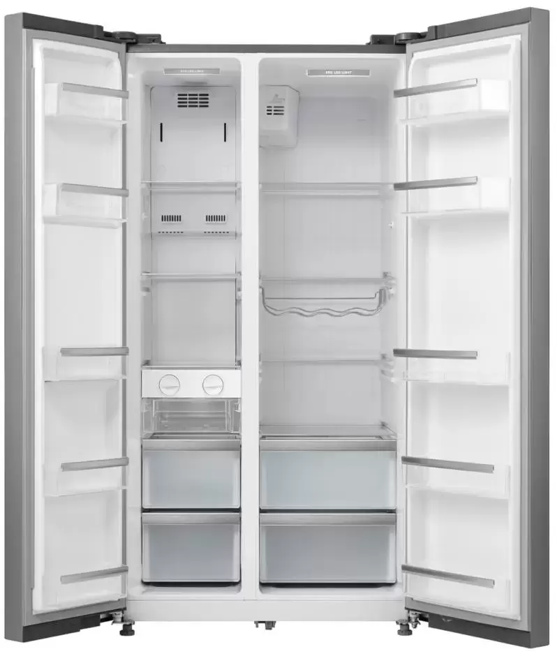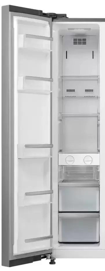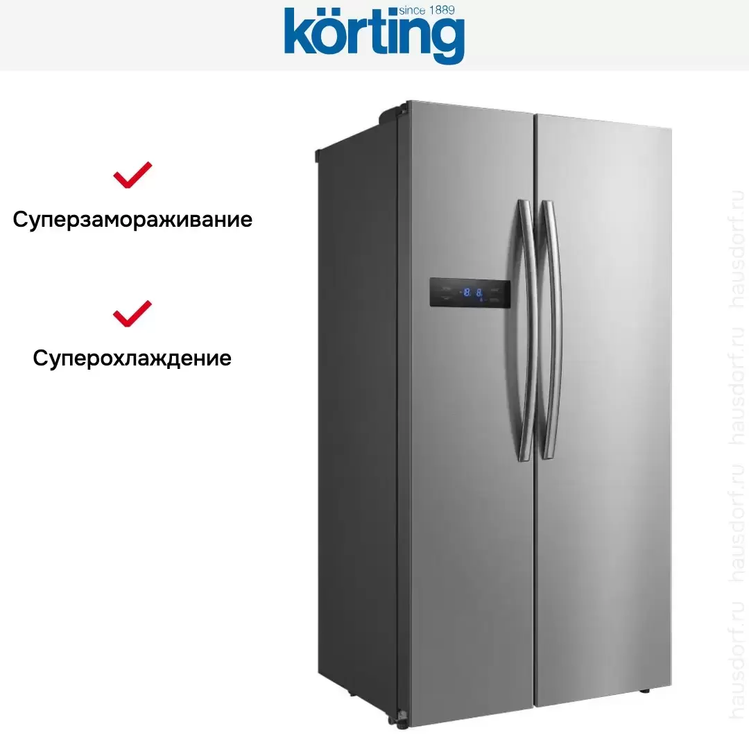 Korting KNFS 91797 X — отдельно стоящий холодильник Side-By-Side высотой 179 см и шириной 90 см в корпусе цвета нержавеющей стали с удобными большими вертикальными ручками. Общий объем его составляет 510 литров, левая морозильная камера имеет объем 175 литров. Система размораживания No Frost без образованию инея и льда в обоих отделениях гарантирует легкую очистку стенок — их достаточно протереть влажной губкой.