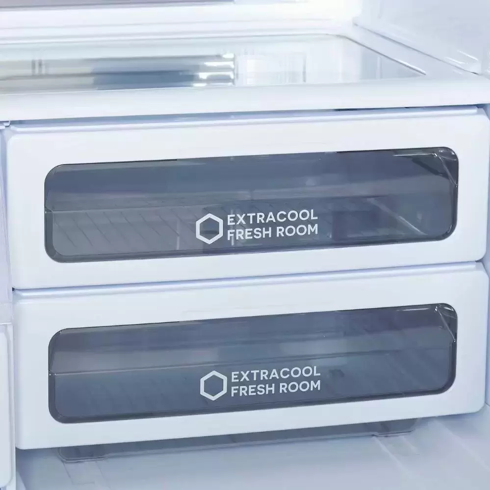 Высота составляет 172 см, ширина — 89.2 см, а глубина — 77 см, что обеспечивает достаточно места для хранения большого количества продуктов. Общий полезный объем составляет 556 литров, из которых 345 литров занимает холодильная камера и 211 литров — морозильная. Модель включает в себя три камеры и четыре двери, что позволяет эффективно распределять продукты и удобно ими пользоваться.