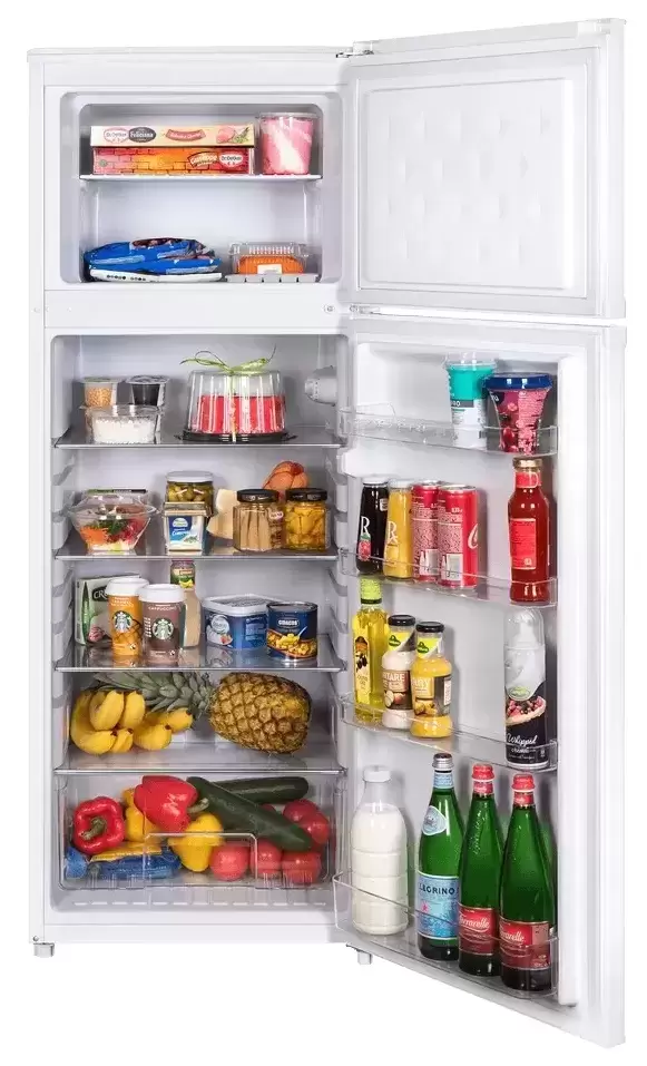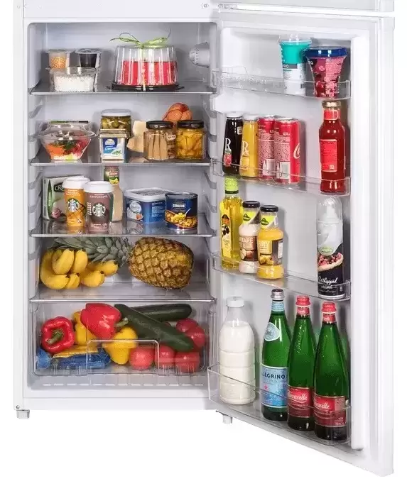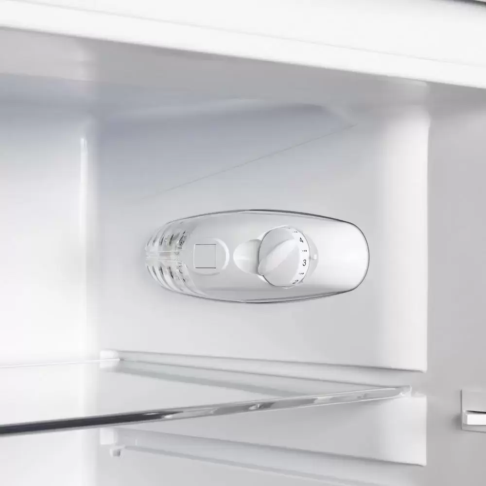 В холодильной камере с ярким внутренним освещением для хранения продуктов предусмотрены три полки из закаленного стекла с металлической окантовкой, регулируемые по высоте. На дверце имеются три полки и контейнер для яиц, а в нижней части камеры находится вместительный выдвижной ящик для хранения фруктов и овощей. В морозильной камере находятся две полки из прозрачного экологически безопасного пластика и форма для получения кубиков льда. Производительность замораживания составляет 2 кг продуктов в сутки. Механическая панель управления с поворотным переключателем поможет выбрать один из семи температурных режимов. Конденсаторная решетка закрытого типа на задней стенка позволяет устанавливать холодильник вплотную к стене.