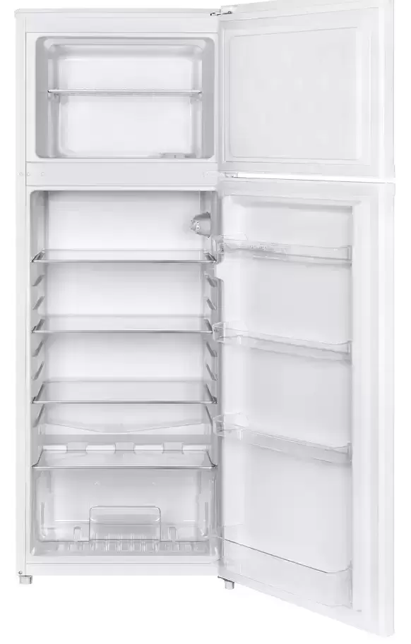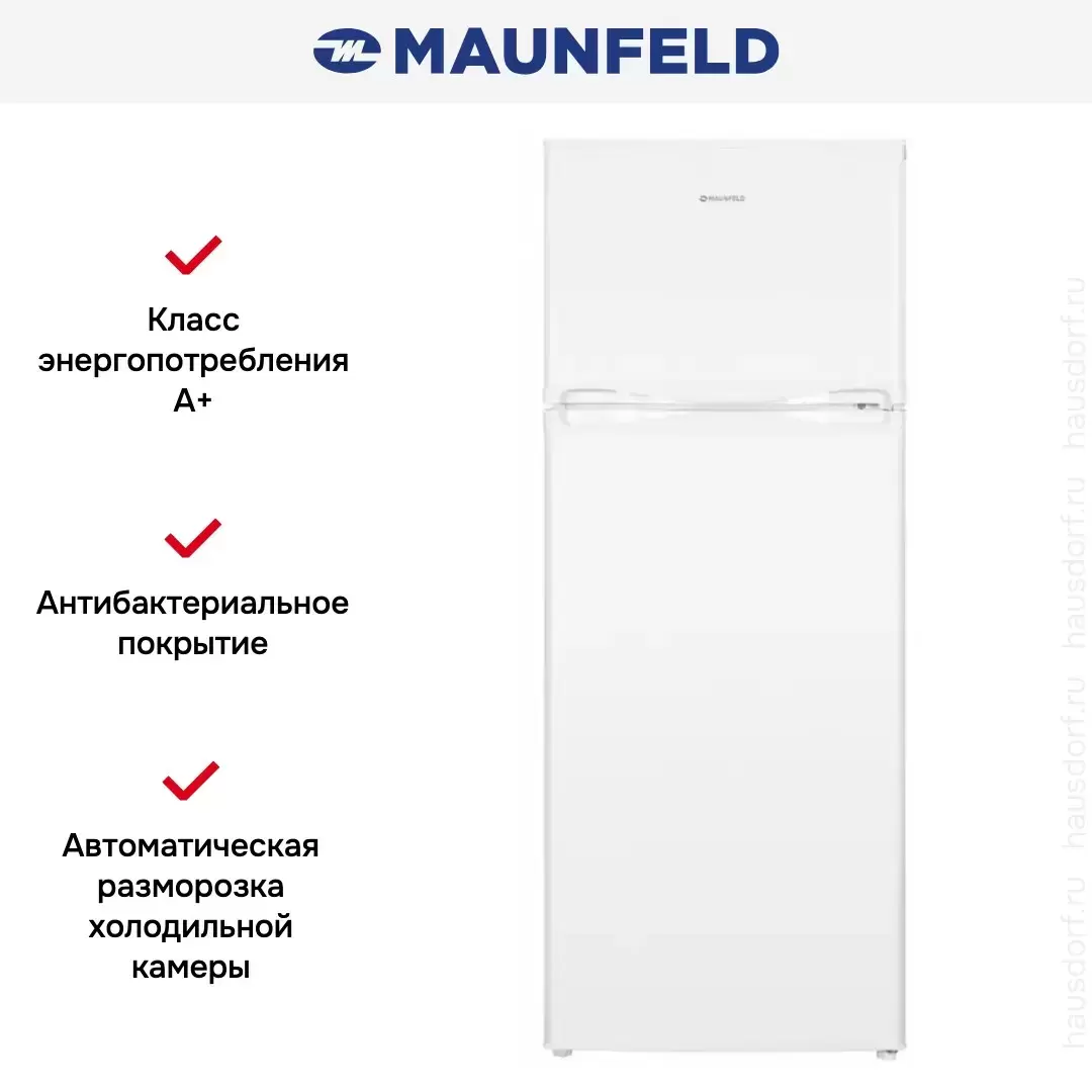 Maunfeld MFF143W — небольшой отдельно стоящий двухкамерный холодильник в корпусе белого цвета. Модель высотой 143 см и шириной 54 см с верхней морозильной камерой — хороший вариант для установки в небольшой кухне, студии, на даче. Корпус изготовлен из металла с покрытием из эмали, дверной упор расположен справа, но имеется возможность его переноса на левую сторону. Климатический класс ST свидетельствует, что прибор будет стабильно работать при температуре окружающей среды от + 18 до + 38 градусов. Высокий класс энергопотребления A+ гарантирует малый расход электроэнергии.