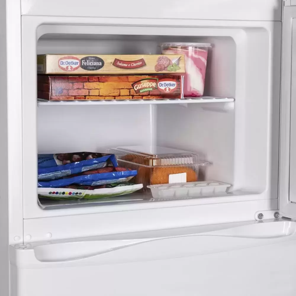 Несмотря на скромные габариты, холодильник достаточно вместителен — его общий объем составляет 209 литров, а объем морозильной камеры — 44 литра. Специальное антибактериальное покрытие камеры позволяет избавиться от неприятных запахов и не допустить размножения болезнетворных микробов. Автоматическая система размораживания обеих камер препятствует обледенению стенок, так что уход за пробором занимает минимум времени.